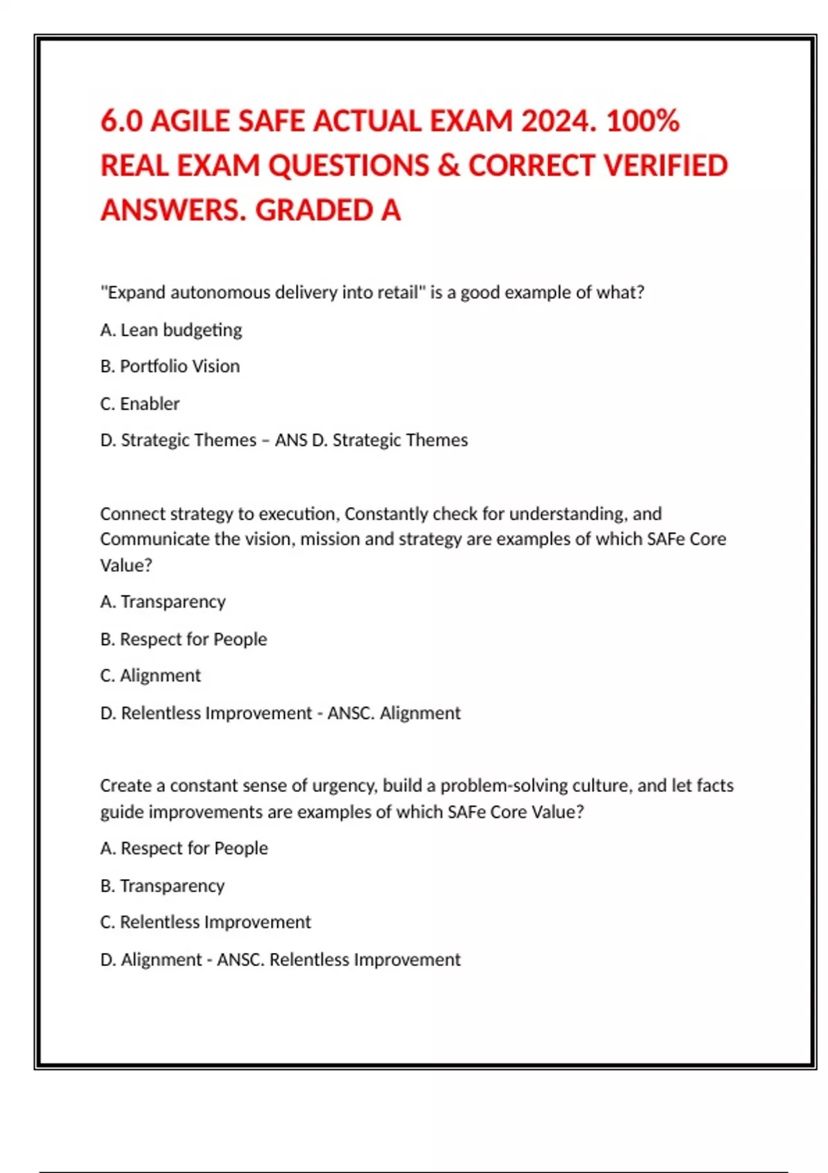6.0 AGILE SAFE ACTUAL EXAM 2024. 100- REAL EXAM QUESTIONS & CORRECT VERIFIED ANSWERS.