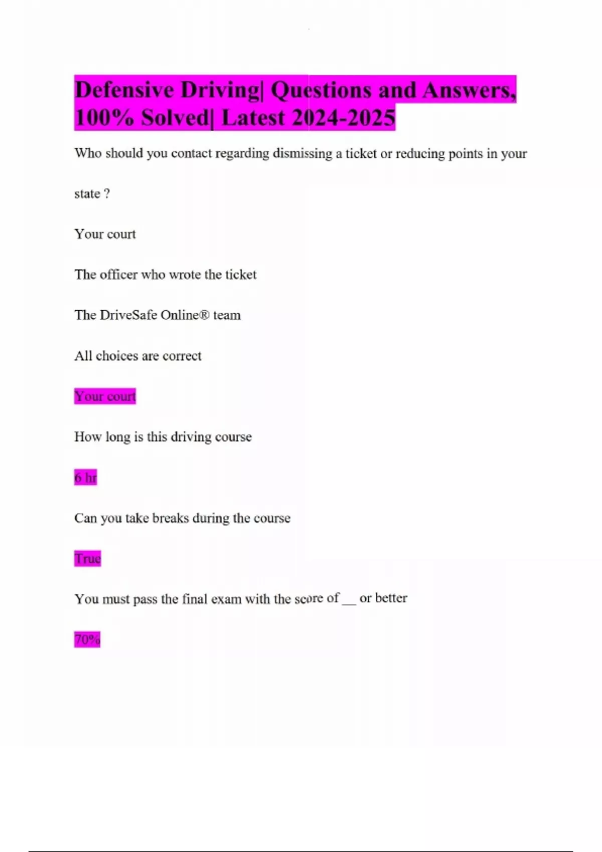 Defensive Driving| Questions and Answers, 100% Solved| Latest Who should you contact regarding dismissing a ticket or reducing points in your state ? Your court The officer who wrote the ticket The DriveSafe Online® team All choices are correct Your court How long is this driving course 6 hr Can you take breaks during the course True You must pass the final exam with the score of __ or better 70%Which of the following are among the top 4 human choice factors that contributed to a rise in Rodeway deaths in 2015 Distracted driving Drunk driving Speeding Speeding was a factor in about what percentage of fatal crashes in 2015 25% What is the leading cause of death for people age 16 to 24 Traffic accidents About __ percent of all fatally injured passengers in passenger vehicles were not wearing a seatbelt in 2015 50% Which of the following is an example of economic loss? Workplace losses Medical expensesProperty damage All choices are correct All choices are correct Which of the following is not a recommendation for dealing with an aggressive driver Maintain your lane when being followed closely Select all the emotional states that may affect your driving