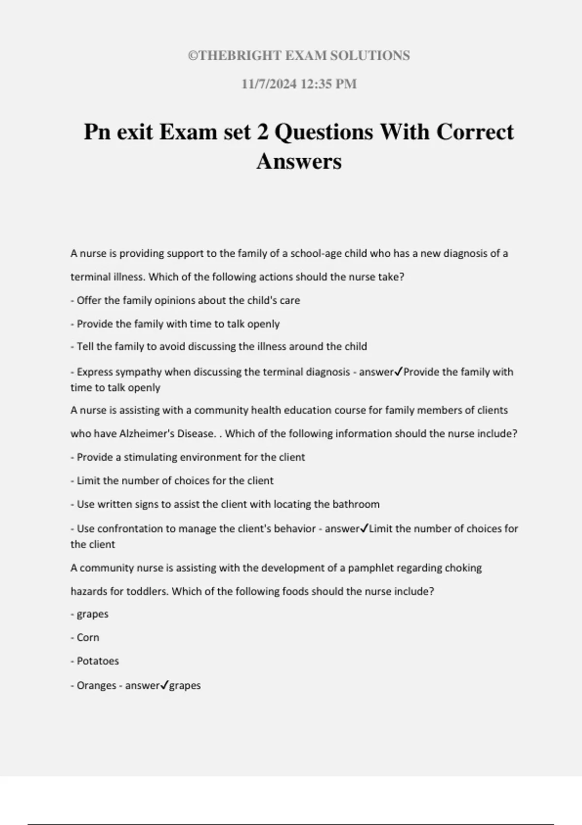 Pn exit Exam set 2 Questions With Correct Answers A nurse is providing support to the family of a school-age child who has a new diagnosis of a terminal illness. Which of the following actions should the nurse take? - Offer the family opinions about the child's care - Provide the family with time to talk openly - Tell the family to avoid discussing the illness around the child - Express sympathy when discussing the terminal diagnosis - answerProvide the family with time to talk openly A nurse is assisting with a community health education course for family members of clients who have Alzheimer's Disease. . Which of the following information should the nurse include? - Provide a stimulating environment for the client - Limit the number of choices for the client - Use written signs to assist the client with locating the bathroom - Use confrontation to manage the client's behavior - answerLimit the number of choices for the client A community nurse is assisting with the development of a pamphlet regarding choking hazards for toddlers. Which of the following foods should the nurse include? - grapes - Corn - Potatoes - Oranges - answergrapes ©THEBRIGHT EXAM SOLUTIONS 11/7/2024 12:35 PM A nurse is caring for a female client who has an indwelling catheter with a urinary drainage system. Which of the following actions should the nurse take? - Secure the tubing with adhesive tape to the lower abdomen - Instruct the client to hold the drainage bag at waist height when ambulating - Collect a sterile specimen from the urinary drainage bag - Coil the tubing on the bed above the collection bag - answer- Coil the tubing on the bed above the collection bag A nurse is reinforcing with a client who has hypothyroidism and a new prescription for levothyroxine. The nurse should instruct the client to notify the provider of which of the following manifestations? - Polyuria - Pruritus - Cough - nervousness - answerPruritus A nurse is reinforcing teaching with the family of a client who is terminally ill about the grief process. Which of the following should the nurse include in the teaching? - "Anticipatory grieving prolongs the grief process." - " The grieving should be complete within 1 year." - "The stages of grief occur in sequential order." - "Anger toward the health staff is expected." - answer"Anger toward the health staff is expected." A nurse is contributing to the plan of care for a group of clients. Which of the following tasks should the nurse delegate to an assistive personnel? - Obtain the diet history from a client who has heart failure. - Administer a client's nighttime dose of milk of magnesia - Perform basic life support - Educate a client about the use of an incentive spirometer - answerPerform basic life support ©THEBRIGHT EXAM SOLUTIONS 11/7/2024 12:35 PM A nurse is contributing to the plan of care for a client who has hypothyroidism. Which of the following interventions should the nurse include in the plan? - High-calorie, high-protein diet - Administer levothyroxine with client's breakfast - Increase the temperature of the client's room - Tape client's eyelids shut at bedtime - answerIncrease the temperature of the client's room A nurse is preparing to give change of shift report on a client who is 2 days postoperative following a total knee arthroscopy. Which of the following information about the client should the nurse include in the report? - Preferred bath time - Time of last medication - Steps required for dressing changes - Admission vital signs - answerTime of last medication 10. A nurse in a provider's office is collecting data from a client who was just diagnosed with tuberculosis. Which of the following actions should the nurse take first? - Communicate with personnel about the need for prophylaxis - Place a mask on the client - Notify local health department - Contact those who live with the client - answer- Place a mask on the client A nurse is reviewing the medical records of five clients. For which of the following events should the nurse write an incident report? (Select all that apply) - A client fell when ambulating to the bathroom alone - An approximate amount of urine was recorded after the urine leaked from the client's catheter bag. - A client received the first dose of antibiotic 1 hour before the collection of blood for culture and sensitivity. ©THEBRIGHT EXAM SOLUTIONS 11/7/2024 12:35 PM - A client received an 0900 daily medication at 1000. - A client who has an infection refused the evening meal. - answer- A client fell when ambulating to the bathroom alone. — A client received the first dose of antibiotic 1 hour before the collection of blood for culture and sensitivity. A nurse is caring for a client who is postoperative following a total knee arthroplasty. The client reports a pain level of 6 on a scale from 0 to 10. Which of the following medications should the nurse administer? - Oxycodone - Ibuprofen - Celecoxib - Acetaminophen - answer- Oxycodone A nurse is caring for a client who is 2 days postoperative following the surgical creation of an ileostomy and is tolerating oral intake. Which of the following actions should the nurse take? - Apply sterile dressing to the stoma - Insert catheter to drain liquid feces - Empty the ileostomy pouch every 2 to 3 hour - Irrigate the ileostomy with sterile water - answer- Empty the ileostomy pouch every 2 to 3 hour A nurse is reinforcing teaching with a client who has a new prescription for fluoxetine. Which of the following adverse effects should the nurse include in the teaching as an indication of serotonin syndrome? - Diaphoresis - Hypotension - Peripheral edema - Decreased body temperature - answer- Diaphoresis A charge nurse in a long term care facility is discussing ethical theories with a group of