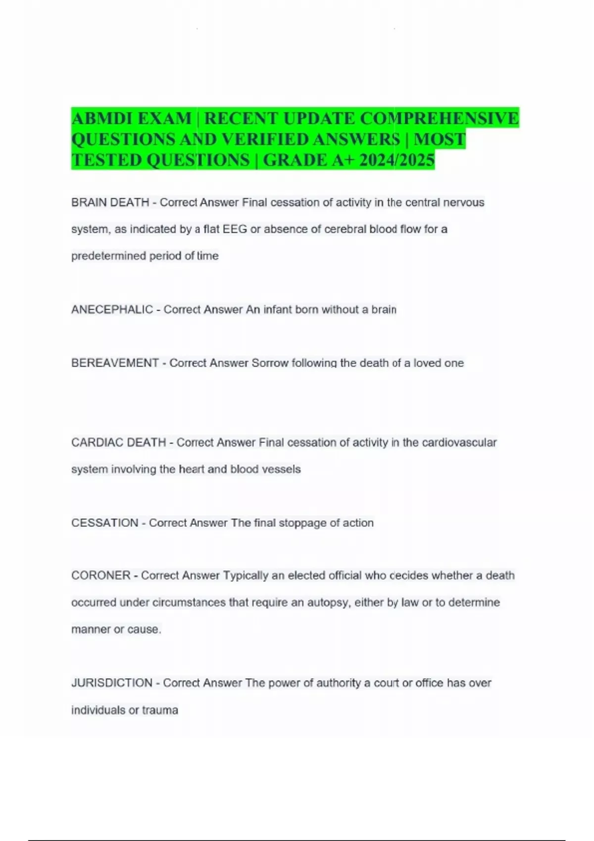 ABMDI EXAM | RECENT UPDATE COMPREHENSIVE QUESTIONS AND VERIFIED ANSWERS | MOST TESTED QUESTIONS | GRADE A+ 2024/2025 BRAIN DEATH - Correct Answer Final cessation of activity in the central nervous system, as indicated by a flat EEG or absence of cerebral blood flow for a predetermined period of time ANECEPHALIC - Correct Answer An infant born without a brain BEREAVEMENT - Correct Answer Sorrow following the death of a loved one CARDIAC DEATH - Correct Answer Final cessation of activity in the cardiovascular system involving the heart and blood vessels CESSATION - Correct Answer The final stoppage of action CORONER - Correct Answer Typically an elected official who decides whether a death occurred under circumstances that require an autopsy, either by law