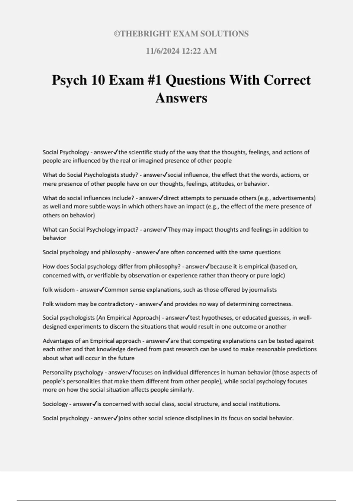 Social Psychology - answer✔the scientific study of the way that the thoughts, feelings, and actions of