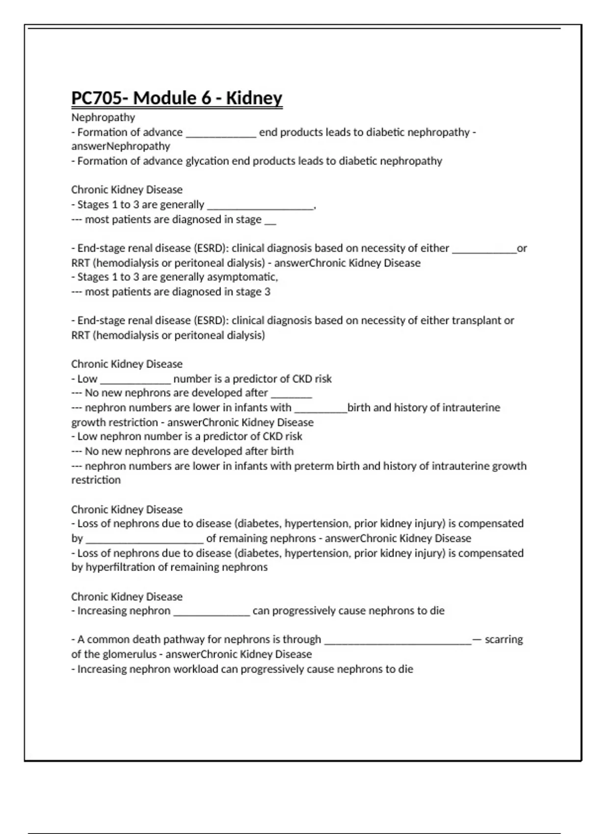 Nephropathy - Formation of advance ____________ end products leads to diabetic nephropathy - answerNephropathy - Formation of advance glycation end products leads to diabetic nephropathy Chronic Kidney Disease - Stages 1 to 3 are generally __________________, --- most patients are diagnosed in stage __ - End-stage renal disease (ESRD): clinical diagnosis based on necessity of either ___________or RRT (hemodialysis or peritoneal dialysis) - answerChronic Kidney Disease - Stages 1 to 3 are generally asymptomatic, --- most patients are diagnosed in stage 3 - End-stage renal disease (ESRD): clinical diagnosis based on necessity of either transplant or RRT (hemodialysis or peritoneal dialysis) Chronic Kidney Disease - Low ____________ number is a predictor of CKD risk --- No new nephrons are developed after _______ --- nephron numbers are lower in infants with _________birth and history of intrauterine growth restriction - answerChronic Kidney Disease - Low nephron number is a predictor of CKD risk --- No new nephrons are developed after birth --- nephron numbers are lower in infants with preterm birth and history of intrauterine growth restriction Chronic Kidney Disease - Loss of nephrons due to disease (diabetes, hypertension, prior kidney injury) is compensated by ____________________ of remaining nephrons - answerChronic Kidney Disease - Loss of nephrons due to disease (diabetes, hypertension, prior kidney injury) is compensated by hyperfiltration of remaining nephrons Chronic Kidney Disease - Increasing nephron _____________ can progressively cause nephrons to die - A common death pathway for nephrons is through _________________________— scarring of the glomerulus - answerChronic Kidney Disease - Increasing nephron workload can progressively cause nephrons to die - A common death pathway for nephrons is through glomerulosclerosis— scarring of the glomerulus Chronic Kidney Disease: ESRD Manifestations - Dependency on ___________ to maintain fluid and electrolyte homeostasis - _______tension and metabolic ___________ - Anemia due to lack of _________________ - answerChronic Kidney Disease: ESRD Manifestations - Dependency on dialysis to maintain fluid and electrolyte homeostasis - Hypertension and metabolic acidosis - Anemia due to lack of erythropoietin Chronic Kidney Disease: ESRD Manifestations - __________ and phosphate abnormalities lead to chronic kidney disease mineral and bone disorder (CKD-MBD) - ________________ and increased risk of cardiovascular disease - answerChronic Kidney Disease: ESRD Manifestations - Calcium and phosphate abnormalities lead to chronic kidney disease mineral and bone disorder (CKD-MBD) - Dyslipidemia and increased risk of cardiovascular disease Prerenal Kidney Damage - D/T inadequate _____ that can occur with shock or sepsis - answerPrerenal Kidney Damage - D/T inadequate RBF that can occur with shock or sepsis Proteinuria - Damage to the ____________ barrier results in proteinuria with subsequent tubular damage - Systemic manifestations: _______________ - answerProteinuria - Damage to the filtration barrier results in proteinuria with subsequent tubular damage - Systemic manifestations: Hypertension Nephrolithiasis AKA Kidney Stones - More common in individuals with ________ and/or diabetes - Maximally ________________ urine increases risk - Diets that favor high urine _________ result in stones formed from calcium oxalate or uric acid - Pregnancy increases urine ____________ which can result in stones formed from Calcium phosphate - answerNephrolithiasis AKA Kidney Stones - More common in individuals with obesity and/or diabetes - Maximally concentrated urine increases risk - Diets that favor high urine acidity result in stones formed from calcium oxalate or uric acid - Pregnancy increases urine alkalinity which can result in stones formed from Calcium phosphate The _____________ is the Functional Unit of the Kidney - answerThe Nephron is the Functional Unit of the Kidney Kidney Structure - Each kidney has about one million ___________ - Each nephron has a ______________(site of filtration) and a __________(site of processing and reabsorption) - answerKidney Structure - Each kidney has about one million nephrons - Each nephron has a glomerulus (site of filtration) and a tubule (site of processing and reabsorption) Kidney Structure - Each nephron has two capillary beds --- _____________ capillaries: highly permeable, high rate of capillary filtration --- _____________ capillaries: highly permeable, high rate of reabsorption - answerKidney Structure - Each nephron has two capillary beds --- Glomerular capillaries: highly permeable, high rate of capillary filtration --- Peritubular capillaries: highly permeable, high rate of reabsorption Kidney Function - Kidneys also produce hormones: renin, _________________, and activated Vitamin D - answerKidney Function - Kidneys also produce hormones: renin, erythropoietin, and activated Vitamin D Total Body Fluid and Electrolyte Balance - To maintain homeostasis, the internal milieu must have relative constancy of fluid and ________________ over daily cycles of input (eating and drinking) and output (defecation, urination, insensible loss) - answerTotal Body Fluid and Electrolyte Balance - To maintain homeostasis, the internal milieu must have relative constancy of fluid and electrolytes over daily cycles of input (eating and drinking) and output (defecation, urination, insensible loss) Total Body Fluid and Electrolyte Balance - Kidneys can excrete wastes in a volume of 300 mL/d, but average adult urine output is 0.8 to ____L/d - answerTotal Body Fluid and Electrolyte Balance - Kidn