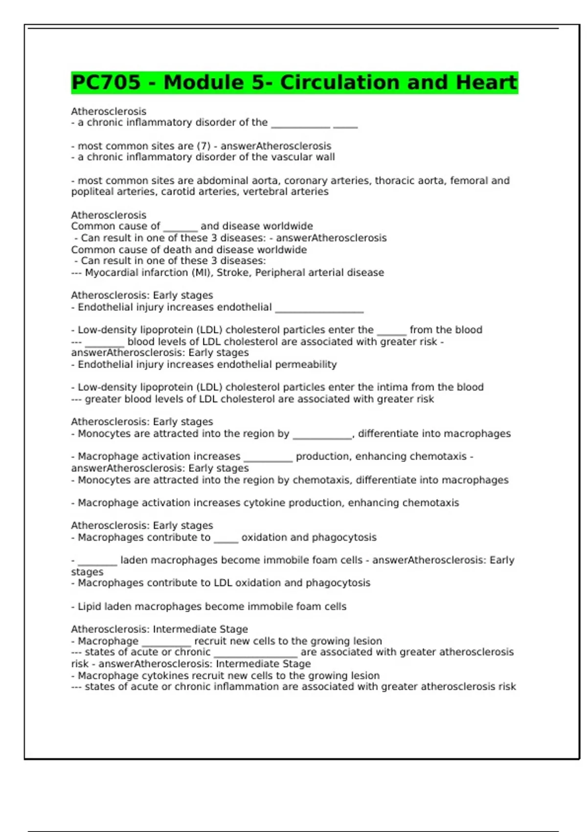 Atherosclerosis - a chronic inflammatory disorder of the ____________ _____ - most common sites are (7) - answerAtherosclerosis - a chronic inflammatory disorder of the vascular wall - most common sites are abdominal aorta, coronary arteries, thoracic aorta, femoral and popliteal arteries, carotid arteries, vertebral arteries Atherosclerosis Common cause of _______ and disease worldwide - Can result in one of these 3 diseases: - answerAtherosclerosis Common cause of death and disease worldwide - Can result in one of these 3 diseases: --- Myocardial infarction (MI), Stroke, Peripheral arterial disease Atherosclerosis: Early stages - Endothelial injury increases endothelial __________________ - Low-density lipoprotein (LDL) cholesterol particles enter the ______ from the blood --- ________ blood levels of LDL cholesterol are associated with greater risk - answerAtherosclerosis: Early stages - Endothelial injury increases endothelial permeability - Low-density lipoprotein (LDL) cholesterol particles enter the intima from the blood --- greater blood levels of LDL cholesterol are associated with greater risk Atherosclerosis: Early stages - Monocytes are attracted into the region by ____________, differentiate into macrophages - Macrophage activation increases __________ production, enhancing chemotaxis - answerAtherosclerosis: Early stages - Monocytes are attracted into the region by chemotaxis, differentiate into macrophages - Macrophage activation increases cytokine production, enhancing chemotaxis Atherosclerosis: Early stages - Macrophages contribute to _____ oxidation and phagocytosis - ________ laden macrophages become immobile foam cells - answerAtherosclerosis: Early stages - Macrophages contribute to LDL oxidation and phagocytosis - Lipid laden macrophages become immobile foam cells Atherosclerosis: Intermediate Stage - Macrophage __________ recruit new cells to the growing lesion --- states of acute or chronic _________________ are associated with greater atherosclerosis risk - answerAtherosclerosis: Intermediate Stage - Macrophage cytokines recruit new cells to the growing lesion --- states of acute or chronic inflammation are associated with greater atherosclerosis risk Atherosclerosis: Intermediate Stage - T lymphocytes, dendritic cells, mast cells, platelets swell the inflammatory lesion - Initial growth swells vascular external diameter without appreciably __________ the lumen - answerAtherosclerosis: Intermediate Stage - T lymphocytes, dendritic cells, mast cells, platelets swell the inflammatory lesion - Initial growth swells vascular external diameter without appreciably narrowing the lumen Atherosclerosis: Late Stage - Cells in plaque _____ die, leading to necrotic, avascular residue - _________ deposits increase plaque rigidity and are visible on imaging - answerAtherosclerosis: Late Stage - Cells in plaque core die, leading to necrotic, avascular residue