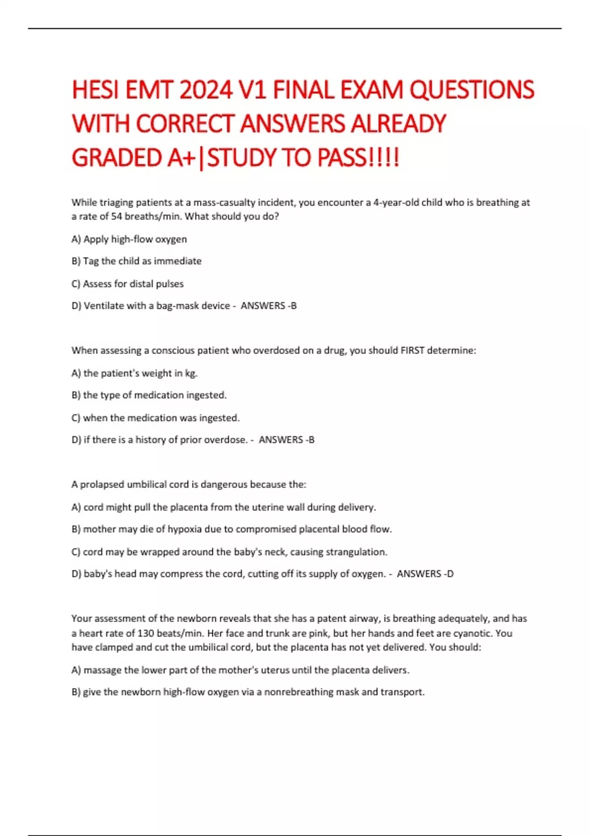 HESI EMT 2024 V1 FINAL EXAM QUESTIONS WITH CORRECT ANSWERS ALREADY GRADED A+|STUDY TO PASS!!!!