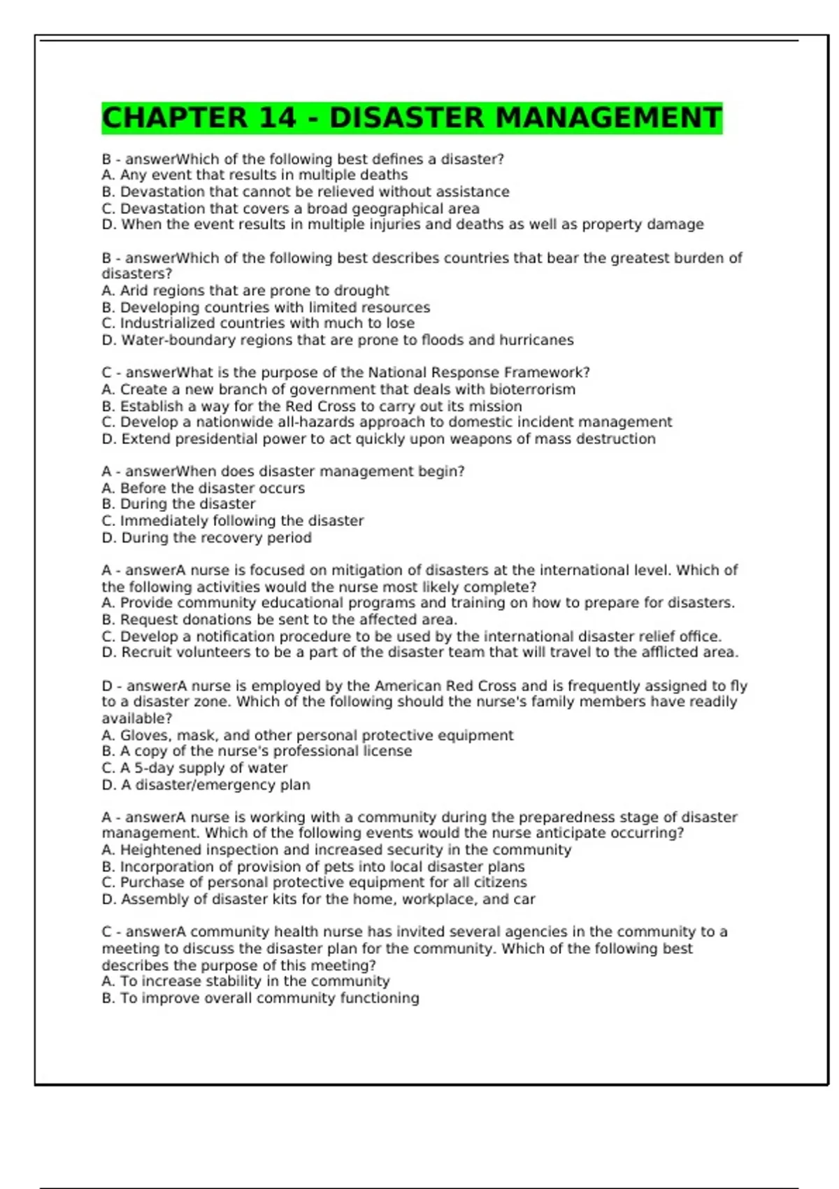 B - answerWhich of the following best defines a disaster?