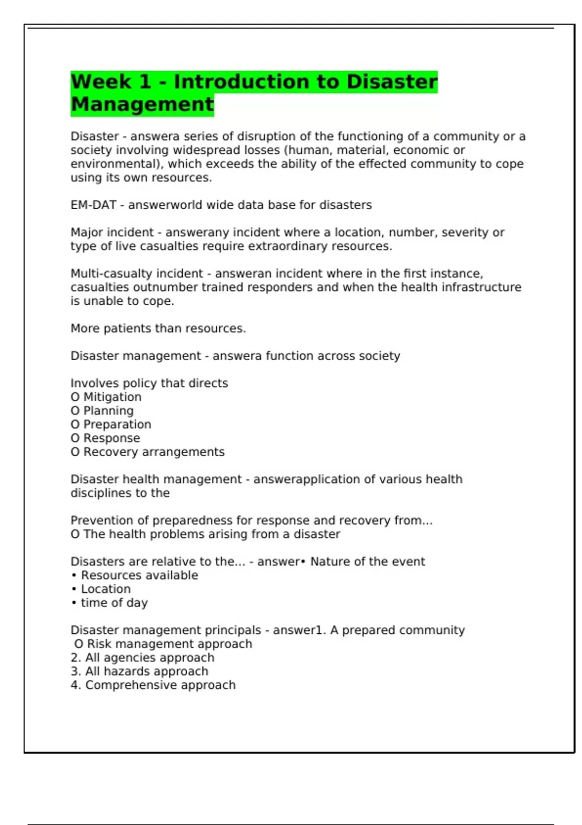 Disaster management principals - answer1. A prepared community