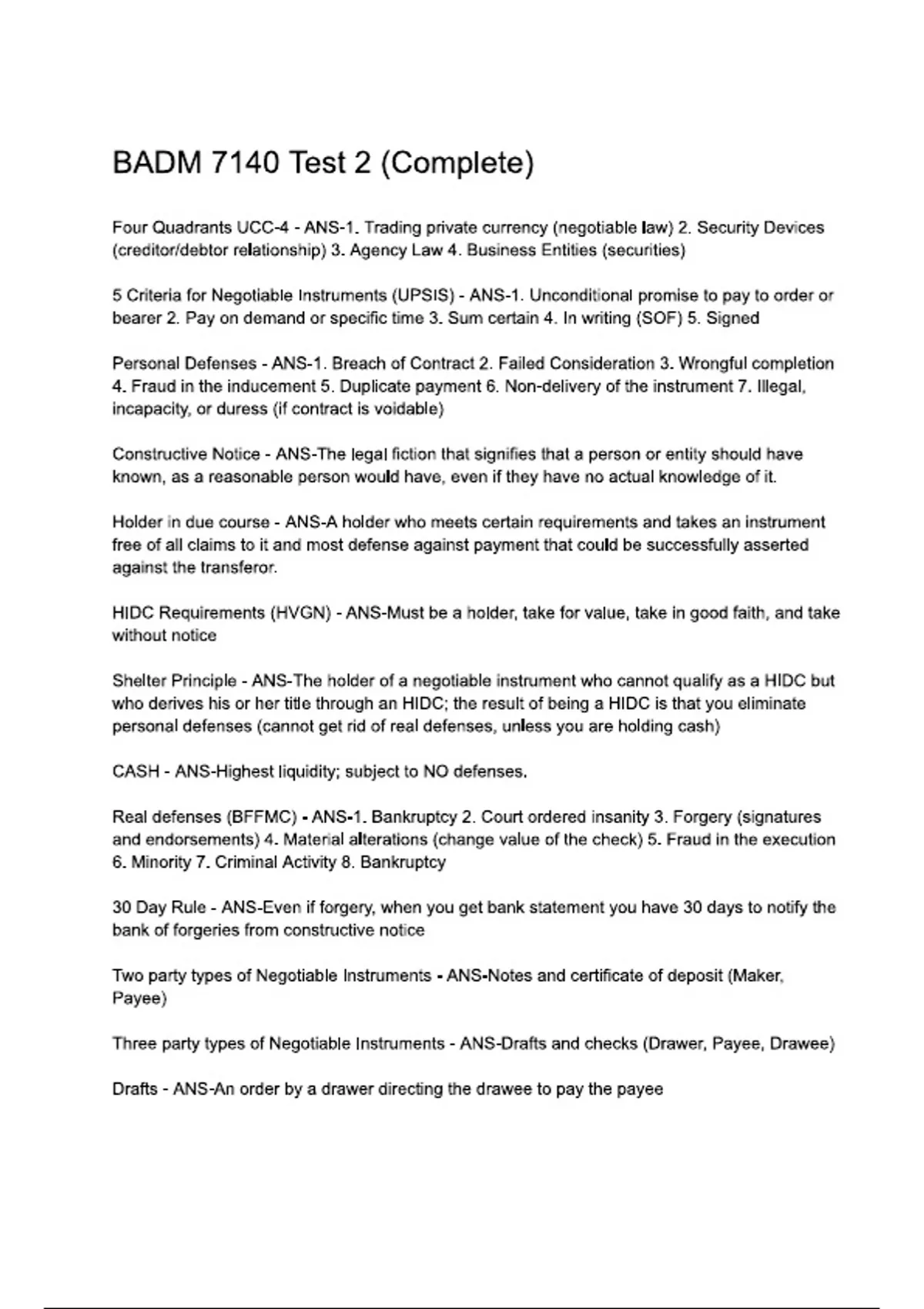 BADM 7140 Test 2 (Complete) exam questions with correct answers with complete A+solution 2024/2025