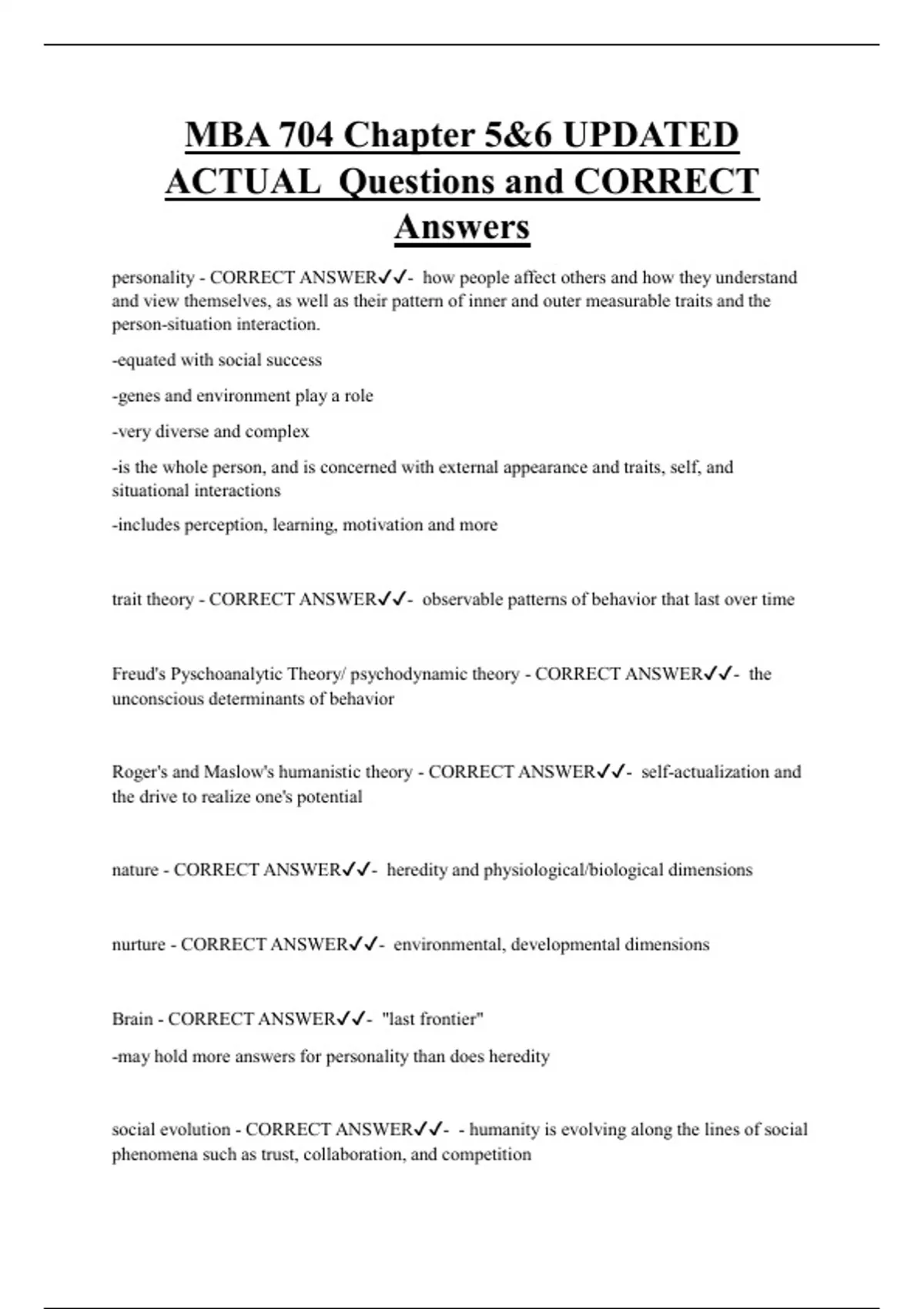 MBA 704 Chapter 5&6 UPDATED ACTUAL Questions and CORRECT Answers personality - CORRECT ANSWER- how people affect others and how they understand and view themselves, as well as their pattern of inner and outer measurable traits and the person-situation interaction. -equated with social success -genes and environment play a role -very diverse and complex -is the whole person, and is concerned with external appearance and traits, self, and situational interactions -includes perception, learning, motivation and mor