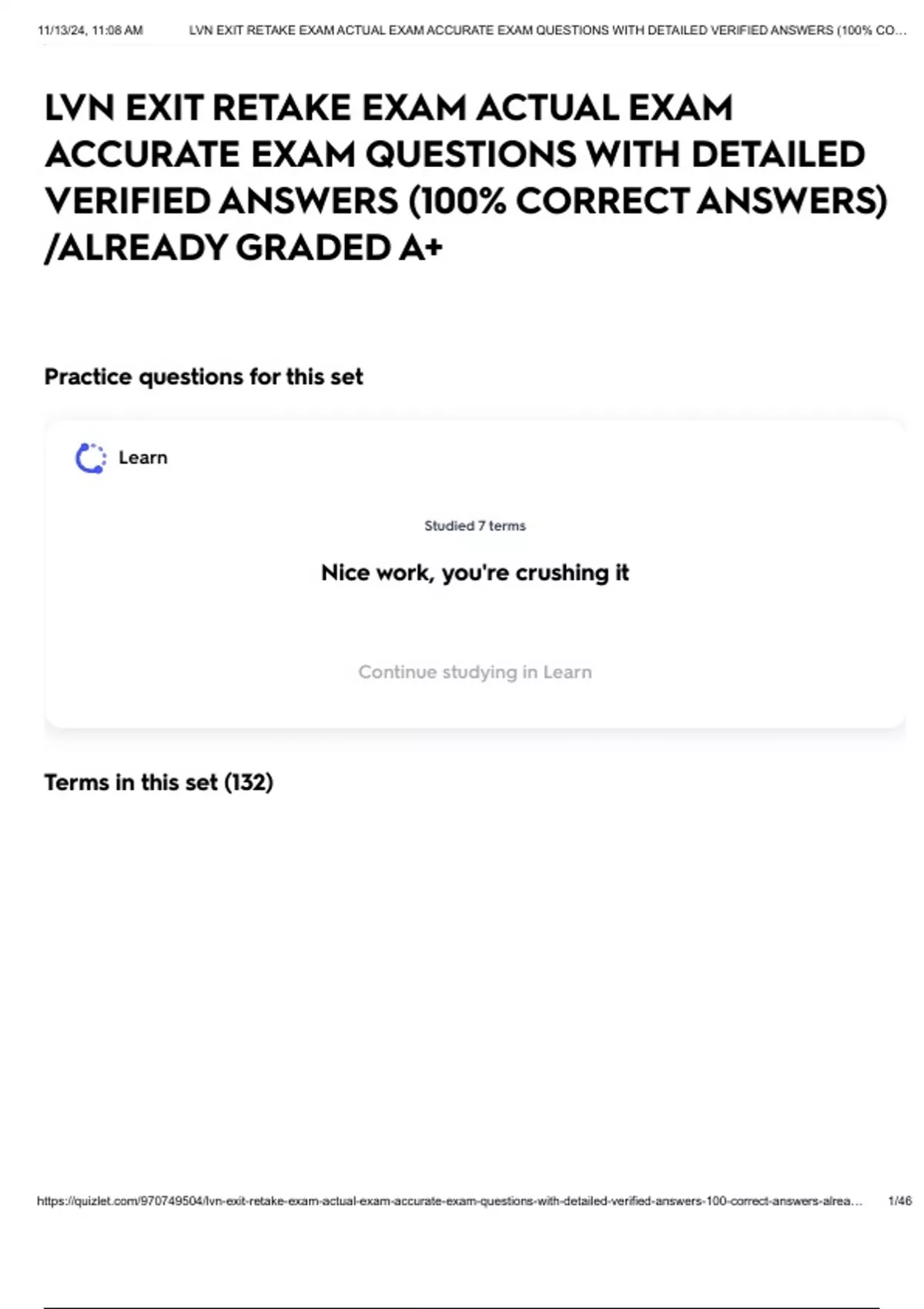 , 11/13/24, 11:08 AM LVN EXIT RETAKE EXAM ACTUAL EXAM ACCURATE EXAM QUESTIONS WITH DETAILED VERIFIED ANSWERS (100% CO…