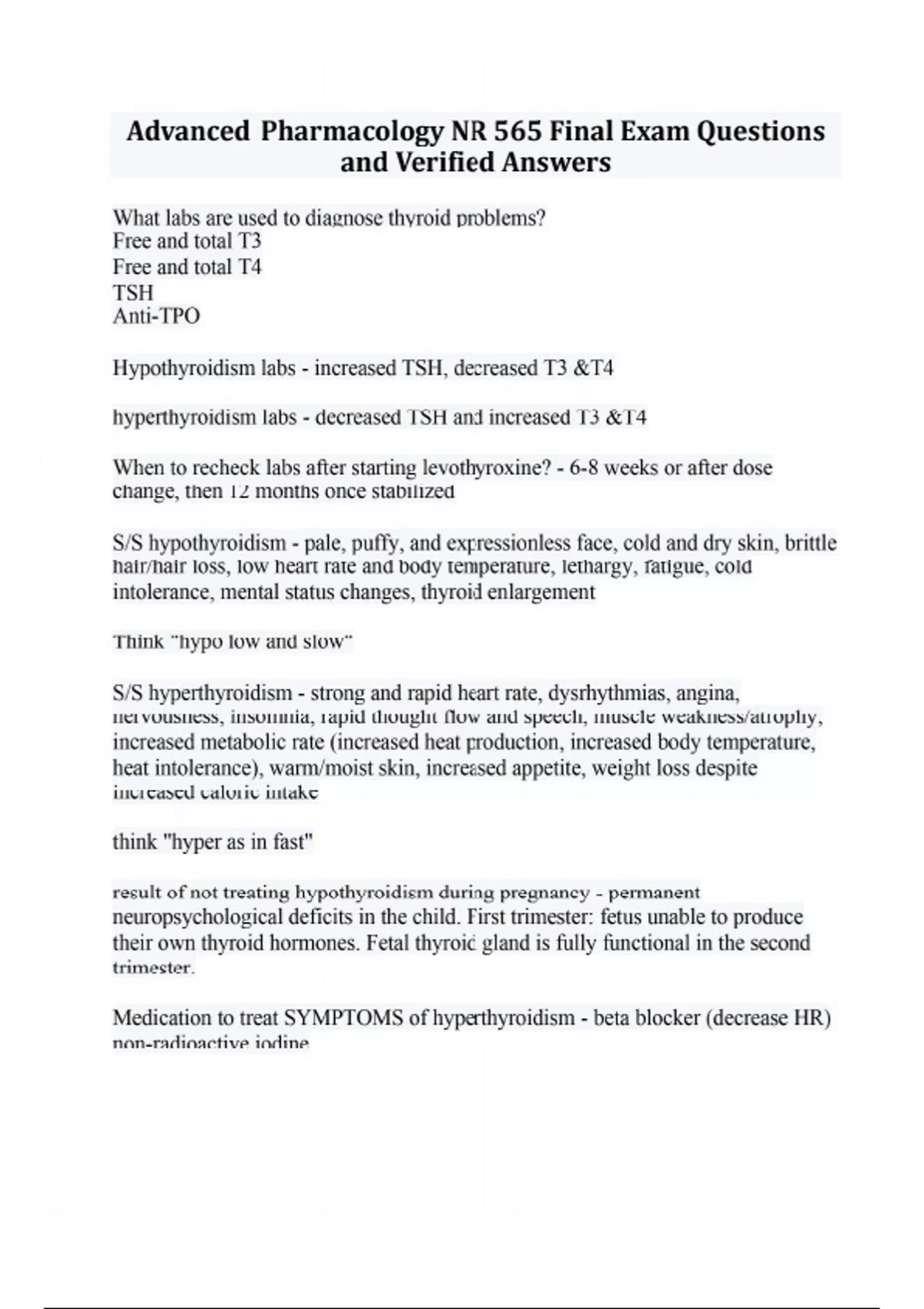 What labs are used to diagnose thyroid problems? Free and total T3 Free and total T4 TSH Anti-TPO Hypothyroidism labs - increased TSH, decreased T3 &T4 hyperthyroidism labs - decreased TSH and increased T3 &T4 When to recheck labs after starting levothyroxine? - 6-8 weeks or after dose change, then 12 months once stabilized S/S hypothyroidism - pale, puffy, and expressionless face, cold and dry skin, brittle hair/hair loss, low heart rate and body temperature, lethargy, fatigue, cold intolerance, mental status changes, thyroid enlargement Think "hypo low and slow" S/S hyperthyroidism - strong and rapid heart rate, dysrhythmias, angina, nervousness, insomnia, rapid thought flow and speech, muscle weakness/atrophy, increased metabolic rate (increased heat production, increased body temperature, heat intolerance), warm/moist skin, increased appetite, weight loss despite increased caloric intake think "hyper as in fast" result of not treating hypothyroidism during pregnancy - permanent neuropsychological deficits in the child. First trimester: fetus unable to produce their own thyroid hormones. Fetal thyroid gland is fully functional in the second trimester. Medication to treat SYMPTOMS of hyperthyroidism - beta blocker (decrease HR) non-radioactive iodine How to take levothyroxine with food? - take on an empty stomach in the morning, 30-60 minutes before breakfast Supplement/drug interactions with levothyroxine - antacids, iron, calcium Confirm diabetes diagnosis prior to treatment - fasting plasma glucose greater than or equal to 126, A random plasma glucose of greater than or equal to 200 plus symptoms of diabetes, an oral glucose tolerance test of two hours, plasma glucose of greater than or equal to 200, or a hemoglobin A1c, a 6.5 or higher (on two occasions) A1c general goal - <7% Older adult A1c goal - <8% When should insulin be considered? - For patients with an A1c >10%, a fasting blood glucose >300 or are markedly symptomatic At what interval should A1c be rechecked? - 2-4 times a year (every 3 months) until A1c drops to 7% and at least every 6 months there after action of insulin - regulation of glucose metabolism. Insulin promotes glucose and amino acid uptake into muscle and adipose tissues, and other tissues except brain and liver. It also has an anabolic role in stimulating glycogen, fatty acid, and protein synthesis First, it stimulates cellular transport (uptake) of glucose, amino acids, nucleotides, and potassium. Second, insulin promotes synthesis of complex organic molecules. Under the influence of insulin and other factors, glucose is converted into glycogen, amino acids are assembled into proteins, and fatty acids are incorporated into triglycerides Pioglitazone (TZD) contraindications - do not give to patients with heart failure or history of bladder cancer GLP-1 - glucagon-like peptide-1 receptor agonist ending in -glutide/tide ex. semaglutide TZD - Thiazolidinedione's end in -ones ex. glitazones DPP4-1 - Dipeptidyl Peptidase-4 inhibitors end in -gliptin ex. gliptins SGLT2i - sodium-glucose contransporter 2 inhibitors end in-flozin Which drug class should be considered for diabetes prior to insulin - metformin Ratio of basal insulin to rapid acting insulin in total daily dose of insulin? - 50% Which diabetic medications come with concern to hypoglycemia? - Amylin Analogues, Insulin, Meglitinides, Sulfonylureas (think these medications AIMS cause hypoglycemia) Treatment of thyroid storm? - K iodine or strong iodine solution to suppress thyroid release and methimazole to suppress thyroid synthesis Preferred treatment is PTU SGLT2i - increase glucose secretion via the urine by inhibiting SLGT in the kidney tubules, decreasing glucose levels and inducing weight loss by caloric loss through the urine higher chance of UTI DPP-4i - Enhance the activity of incretins and thereby increase insulin release, reduce glucagon release, and decrease glucose production by the liver TZD - decreases insulin resistance and increase glucose uptake by muscle and adipose tissue, decrease glucose production by the liver contraindicated in patients with heart failure A newly pregnant mother shows understanding of hypothyroidism in pregnant women by stating - Increase dose up to 50% starting in weeks 4-8 and levels off at week 16 It can cause neurophysiological damage such as IQ, mental development, derangement of growth Biguanide mechanism of action - decreases glucose production by the liver ex. metformin (used for PCOS too) Metformin contraindicated - renal insufficiency d/t risk of lactic acidosis HF A female patient is taking canagliflozin comes in with a UTI and 6 months ago had a fungal infection. What are the next steps? - -flozin (SGlT2i) dc and change medications Methylxanthines- risk for toxicity - Smokers require higher doses. Smoking increases clearance so if you stop smoking levels will rise to toxic levels. Heart disease and liver disease require lower doses. Initial doses are based on weight and age Methylxanthines should be used cautiously in patients that have an untreated seizure disorder or peptic ulcer disease. Overdose/toxicity can cause severe dysrhythmias and convulsions. To manage toxicity, discontinue medication use, and administer activated charcoal plus a cathartic. Have IV lidocaine or amiodarone and IV benzodiazepines on hand if the patient is in the hospital. Older patients are at much higher risk for toxicity when taking methylxanthines. Asthma and COPD - manage with a BLANK as needed - SABA sulfonylureas MOA - Promote insulin secretion by the pancreas stimulate beta cells of the pancreas to secrete more insulin. Stimulates insulin release from pancreatic islet-will only work in DM2. increased risk of hypoglycemic events Do not use it in pregnancy and breastfeeding examples: Glimepiride (Amaryl) Glyburide (DiaBeta; Micronase) Glipizide (Glucotrol) end in -ide GLP-1 MOA - increase in insulin production and inhibit postprandial glucagon release and increase satiety