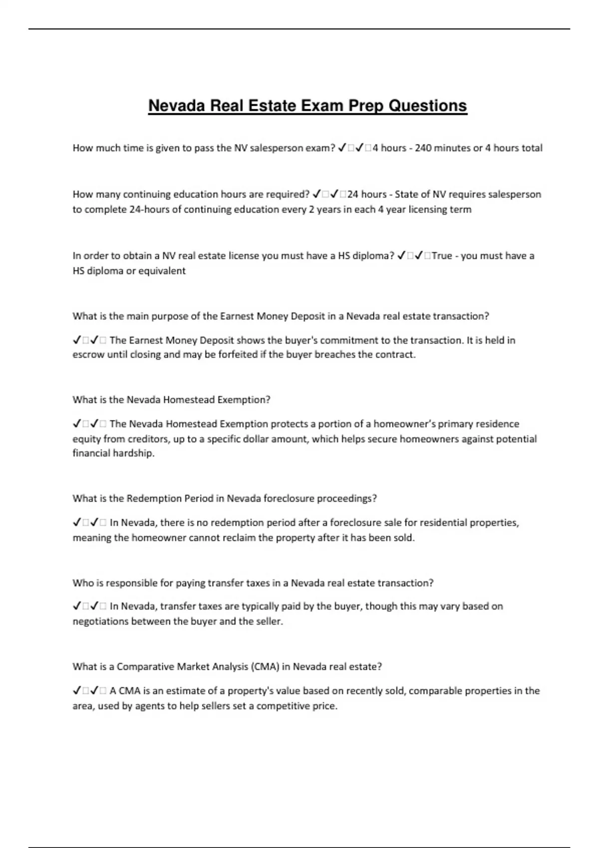 Nevada Real Estate Exam Prep Questions How much time is given to pass the NV salesperson exam? ️️4 hours - 240 minutes or 4 hours total How many continuing education hours are required? ️️24 hours - State of NV requires salesperson to complete 24-hours of continuing education every 2 years in each 4 year licensing term In order to obtain a NV real estate license you must have a HS diploma? ️️True - you must have a HS diploma or equivalent What is the main purpose of the Earnest Money Deposit in a Nevada real estate transaction? ️️ The Earnest Money Deposit shows the buyer's commitment to the transaction. It is held in escrow until closing and may be forfeited if the buyer breaches the contract. What is the Nevada Homestead Exemption? ️️ The Nevada Homestead Exemption protects a portion of a homeowner’s primary residence equity from creditors, up to a specific dollar amount, which helps secure homeowners against potential financial hardship. What is the Redemption Period in Nevada foreclosure proceedings? ️️ In Nevada, there is no redemption period after a foreclosure sale for residential properties, meaning the homeowner cannot reclaim the property after it has been sold. Who is responsible for paying transfer taxes in a Nevada real estate transaction? ️️ In Nevada, transfer taxes are typically paid by the buyer, though this may vary based on negotiations between the buyer and the seller. What is a Comparative Market Analysis (CMA) in Nevada real estate? ️️ A CMA is an estimate of a property's value based on recently sold, comparable properties in the area, used by agents to help sellers set a competitive price. How long must a real estate professional keep transaction records in Nevada? ️️ Nevada real estate professionals are required to keep transaction records for a minimum of five years to comply with state regulations. What is "due diligence" in Nevada real estate? ️️ Due diligence refers to the period during which a buyer inspects the property, reviews disclosures, and assesses other factors to confirm the property's condition and suitability for purchase. What is a Broker Price Opinion (BPO), and is it permitted in Nevada? ️️ A BPO is an estimate of a property's value given by a licensed broker based on market data. In Nevada, BPOs are permitted, but only by licensed brokers or qualified agents under specific circumstances. What must a Nevada real estate agent do if they receive multiple offers on a property? ️️ An agent must present all offers to the seller promptly, allowing the seller to consider each offer before deciding, unless otherwise instructed in writing. What are "material facts" in Nevada real estate, and why are they important? ️️ Material facts are any facts that could affect a buyer's decision to purchase a property. Agents must disclose material facts to buyers to maintain transparency and comply with Nevada law. What is a Short Sale, and how does it work in Nevada? ️️ A Short Sale in Nevada occurs when a property is sold for less than the amount owed on the mortgage. The lender must approve the sale, and the homeowner may still owe a deficiency. What does "escrow" mean in a Nevada real estate transaction? ️️ Escrow refers to a neutral third party holding funds and documents until all conditions of a real estate transaction are met, ensuring secure transfer between buyer and seller. How can a Nevada real estate license be placed on inactive status? ️️ A Nevada real estate license can be placed on inactive status by filing the appropriate form with the Nevada Real Estate Division, allowing the licensee to pause their practice without forfeiting their license. What is an Appraisal Contingency in Nevada real estate? ️️ An appraisal contingency allows a buyer to cancel the contract if the property does not appraise at or above the agreed purchase price, protecting the buyer from overpaying. What are the penalties for practicing real estate without a license in Nevada? ️️ Practicing real estate without a license in Nevada is illegal and can result in fines, penalties, and possible criminal charges from the Nevada Real Estate Division. What must be included in a Nevada Purchase Agreement for it to be valid? ️️ A valid Nevada Purchase Agreement must include the names of the buyer and seller, property description, price, financing terms, and both parties' signatures to be legally binding. What is a Land Contract in Nevada, and how does it differ from a traditional mortgage? ️️ A Land Contract in Nevada allows the buyer to pay for the property directly to the seller over time without immediate ownership transfer, unlike a traditional mortgage where ownership transfers at closing. What is a fiduciary relationship in Nevada real estate? ️️ A fiduciary relationship is a relationship of trust between the agent and the client, requiring the agent to act in the client's best interests with loyalty, honesty, and full disclosure. How does a real estate agent in Nevada terminate a listing agreement? ️️ A listing agreement in Nevada can be terminated by mutual consent, expiration of the agreement term, completion of the transaction, or if the agent or client breaches the agreement. 4. How often must you renew your sales agent license? ️️Every 2 years - NV salespeople and brokers must renew their license one year after their initial licensure. After the first renewal cycle realtors must renew every two years by the original date of issuance. 5. How old do you have to be in NV to obtain a real estate license? ️️18 years old 6. Which of these is a fixture? Refrigerator, Microwave, Free Standing Work Bench, or Window Blinds ️️Window blinds - fixtures are articles of personal property that are attached (screwed in, etc.) and become real property. When window blinds are screwed into the home. They become part of the improvement that is part of the real property.