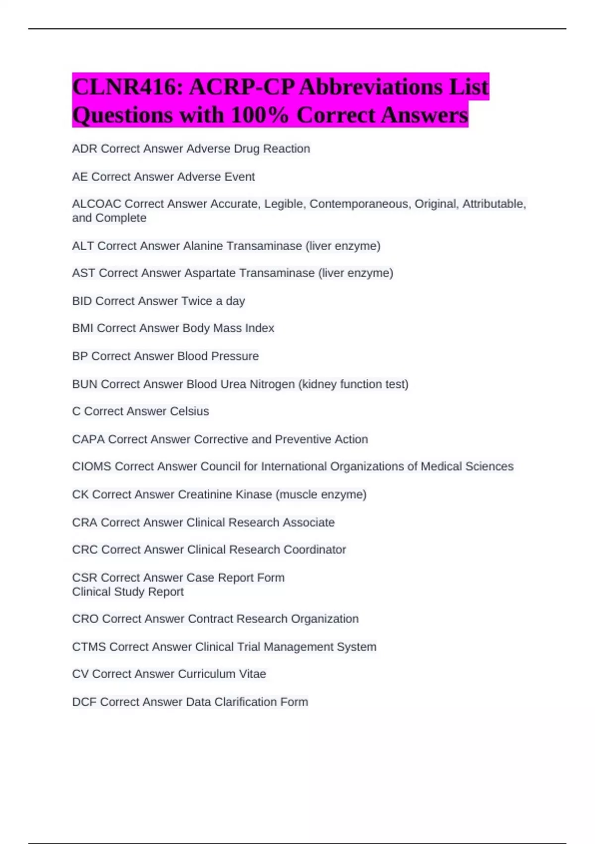 CLNR416: ACRP-CP Abbreviations List Questions with 100% Correct Answers