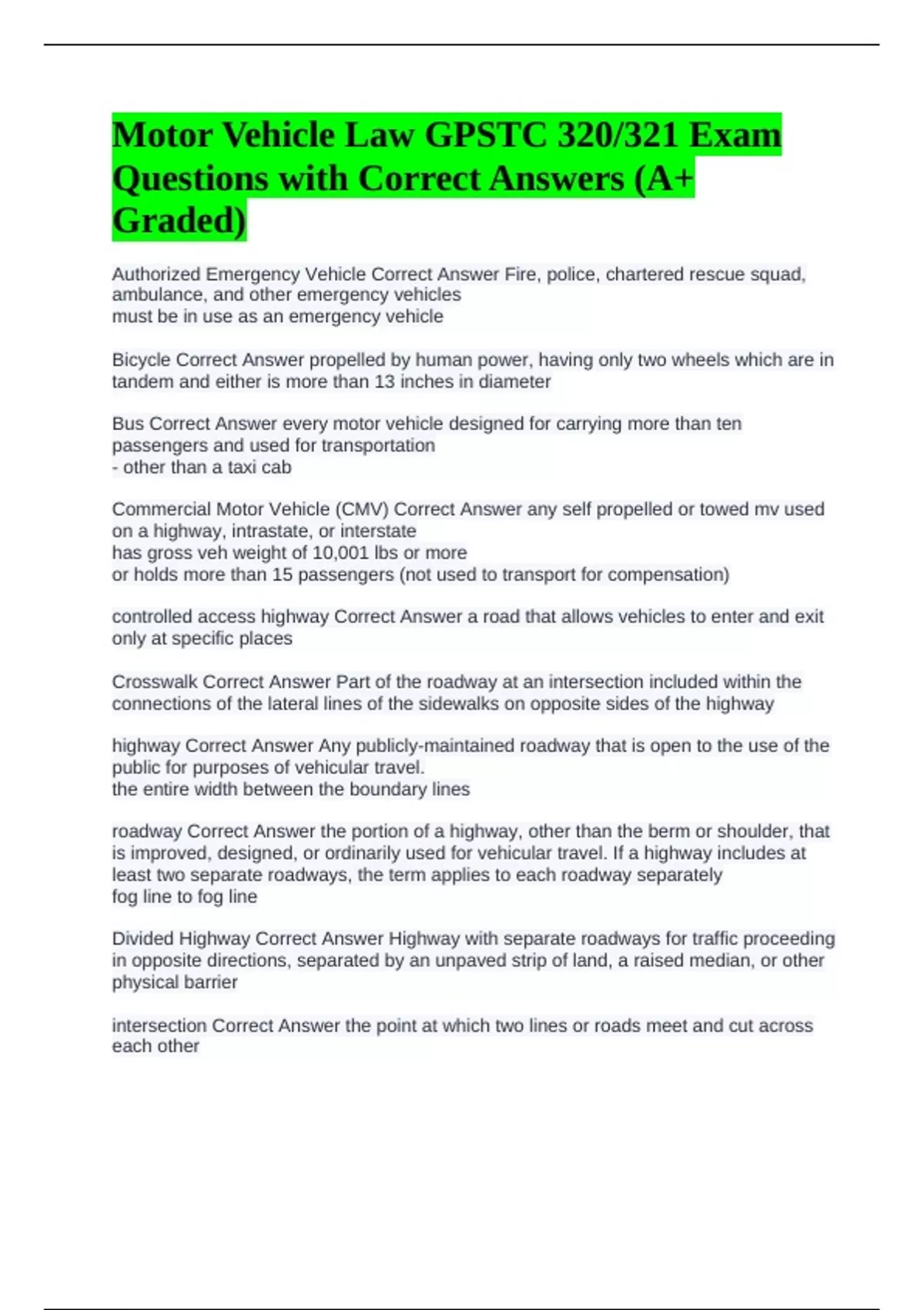 Motor Vehicle Law GPSTC 320/321 Exam Questions with Correct Answers (A+ Graded)