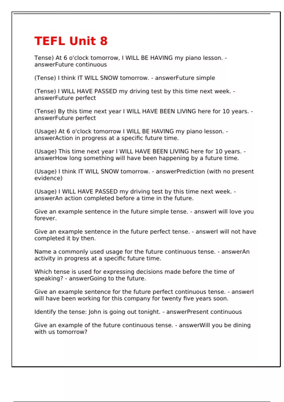 Tense) At 6 o'clock tomorrow, I WILL BE HAVING my piano lesson. - answerFuture continuous (Tense) I think IT WILL SNOW tomorrow. - answerFuture simple (Tense) I WILL HAVE PASSED my driving test by this time next week. - answerFuture perfect (Tense) By this time next year I WILL HAVE BEEN LIVING here for 10 years. - answerFuture perfect (Usage) At 6 o'clock tomorrow I WILL BE HAVING my piano lesson. - answerAction in progress at a specific future time. (Usage) This time next year I WILL HAVE BEEN LIVING here for 10 years. - answerHow long something will have been happening by a future time. (Usage) I think IT WILL SNOW tomorrow. - answerPrediction (with no present evidence) (Usage) I WILL HAVE PASSED my driving test by this time next week. - answerAn action completed before a time in the future. Give an example sentence in the future simple tense. - answerI will love you forever. Give an example sentence in the future perfect tense. - answerI will not have completed it by then. Name a commonly used usage for the future continuous tense. - answerAn activity in progress at a specific future time. Which tense is used for expressing decisions made before the time of speaking? - answerGoing to the future. Give an example sentence for the future perfect continuous tense. - answerI will have been working for this company for twenty five years soon. Identify the tense: John is going out tonight. - answerPresent continuous Give an example of the future continuous tense. - answerWill you be dining with us tomorrow? Which usage is NOT associated with the future simple tense. - answerPrediction with present evidence. Which usage is NOT associated with the going to future tense. - answerSpontaneous decisions (decisions made at the time of speaking) Which of the following tenses is used for expressing spontaneous decisions made at the time of speaking? - answerFuture simple Identify the tense: The next bus for New York leaves at 9:00 a.m. - answerPresent sinple Which tense is NOT used for expressing predictions. - answerPresent