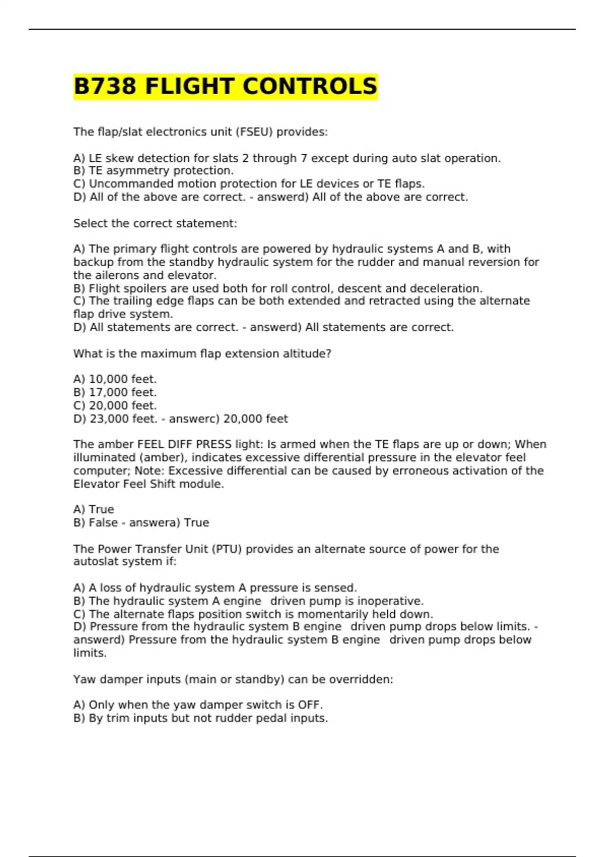 The flap/slat electronics unit (FSEU) provides: A) LE skew detection for slats 2 through 7 except during auto slat operation. B) TE asymmetry protection. C) Uncommanded motion protection for LE devices or TE flaps. D) All of the above are correct. - answerd) All of the above are correct. Select the correct statement: A) The primary flight controls are powered by hydraulic systems A and B, with backup from the standby hydraulic system for the rudder and manual reversion for the ailerons and elevator. B) Flight spoilers are used both for roll control, descent and deceleration. C) The trailing edge flaps can be both extended and retracted using the alternate flap drive system. D) All statements are correct. - answerd) All statements are correct. What is the maximum flap extension altitude? A) 10,000 feet. B) 17,000 feet. C) 20,000 feet. D) 23,000 feet. - answerc) 20,000 feet The amber FEEL DIFF PRESS light: Is armed when the TE flaps are up or down; When illuminated (amber), indicates excessive differential pressure in the elevator feel computer; Note: Excessive differential can be caused by erroneous activation of the Elevator Feel Shift module. A) True B) False - answera) True The Power Transfer Unit (PTU) provides an alternate source of power for the autoslat system if: A) A loss of hydraulic system A pressure is sensed. B) The hydraulic system A engine‐driven pump is inoperative. C) The alternate flaps position switch is momentarily held down. D) Pressure from the hydraulic system B engine‐driven pump drops below limits. - answerd) Pressure from the hydraulic system B engine‐driven pump drops below limits. Yaw damper inputs (main or standby) can be overridden: A) Only when the yaw damper switch is OFF. B) By trim inputs but not rudder pedal inputs. C) By rudder pedal inputs but not trim inputs. D) By either trim or rudder pedal inputs. - answerd) By either trim or rudder pedal inputs An alternate retraction system is provided for the LE devices. A) True B) False - answerb) False The number of slats located on each wing is: A) Two. B) Three. C) Four. D) Six. - answerc) Four