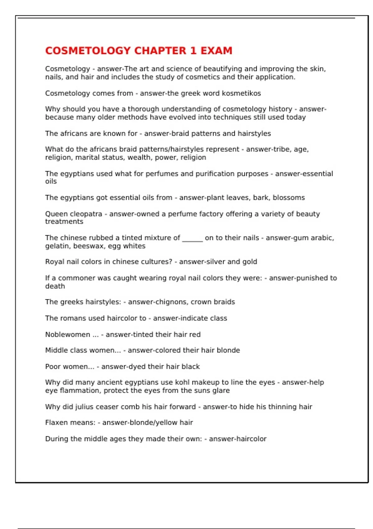 Cosmetology - answer-The art and science of beautifying and improving the skin, nails, and hair and includes the study of cosmetics and their application. Cosmetology comes from - answer-the greek word kosmetikos Why should you have a thorough understanding of cosmetology history - answer-because many older methods have evolved into techniques still used today The africans are known for - answer-braid patterns and hairstyles What do the africans braid patterns/hairstyles represent - answer-tribe, age, religion, marital status, wealth, power, religion The egyptians used what for perfumes and purification purposes - answer-essential oils The egyptians got essential oils from - answer-plant leaves, bark, blossoms Queen cleopatra - answer-owned a perfume factory offering a variety of beauty treatments The chinese rubbed a tinted mixture of ______ on to their nails - answer-gum arabic, gelatin, beeswax, egg whites Royal nail colors in chinese cultures? - answer-silver and gold If a commoner was caught wearing royal nail colors they were: - answer-punished to death The greeks hairstyles: - answer-chignons, crown braids The romans used haircolor to - answer-indicate class Noblewomen ... - answer-tinted their hair red Middle class women... - answer-colored their hair blonde Poor women... - answer-dyed their hair black Why did many ancient egyptians use kohl makeup to line the eyes - answer-help eye flammation, protect the eyes from the suns glare Why did julius ceaser comb his hair forward - answer-to hide his thinning hair Flaxen means: - answer-blonde/yellow hair During the middle ages they made their own: - answer-haircolor During the middle ages the only haircolor options were - answer-light and dark During the middle ages what was the process for lightening the hair? - answer-make a mixture of black sulfur, honey and alum, then sitting in the sun During the middle ages what was the process for darkening the hair? - answer-making a paste of walnut and chesnut and left on hair for 2 days at least! What innovation was introduced by a Persian alchemist in 1000CE? - answer-the steam distillation process The steam distillation process - answer-is basically a diffuser The age of extravagance was the reign of : - answer-queen marie antoinette of france