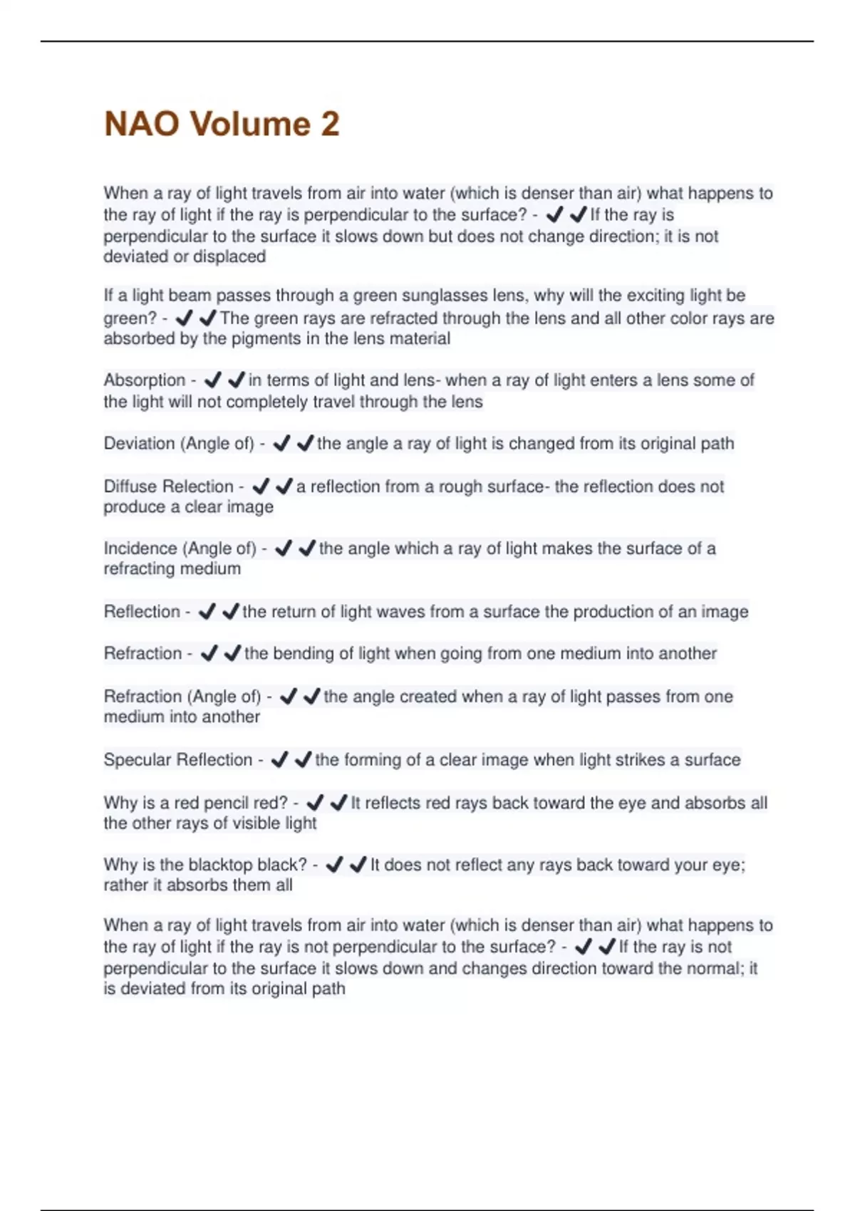 When a ray of light travels from air into water (which is denser than air) what happens to the ray of light if the ray is perpendicular to the surface? - ️️If the ray is perpendicular to the surface it slows down but does not change direction; it is not deviated or displaced If a light beam passes through a green sunglasses lens, why will the exciting light be green? - ️️The green rays are refracted through the lens and all other color rays are absorbed by the pigments in the lens material Absorption - ️️in terms of light and lens- when a ray of light enters a lens some of the light will not completely travel through the lens Deviation (Angle of) - ️️the angle a ray of light is changed from its original path Diffuse Relection - ️️a reflection from a rough surface- the reflection does not produce a clear image Incidence (Angle of) - ️️the angle which a ray of light makes the surface of a refracting medium Reflection - ️️the return of light waves from a surface the production of an image Refraction - ️️the bending of light when going from one medium into another Refraction (Angle of) - ️️the angle created when a ray of light passes from one medium into another Specular Reflection - ️️the forming of a clear image when light strikes a surface Why is a red pencil red? - ️️It reflects red rays back toward the eye and absorbs all the other rays of visible light Why is the blacktop black? - ️️It does not reflect any rays back toward your eye; rather it absorbs them all When a ray of light travels from air into water (which is denser than air) what happens to the ray of light if the ray is not perpendicular to the surface? - ️️If the ray is not perpendicular to the surface it slows down and changes direction toward the normal; it is deviated from its original pathWhen a ray of light travels from water into air ( which is rarer than water) what happens to the ray of light if the ray is perpendicular to the surface? - ️️If the ray is perpendicular to the surface it speeds up but does not change direction; it is not deviated or displaced