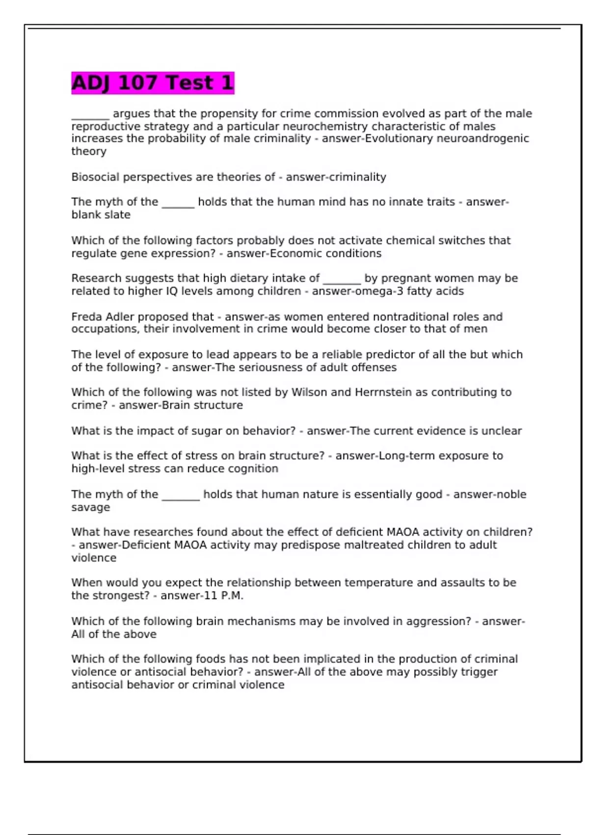 reproductive strategy and a particular neurochemistry characteristic of males increases the probability of male criminality - answer-Evolutionary neuroandrogenic theory Biosocial perspectives are theories of - answer-criminality The myth of the ______ holds that the human mind has no innate traits - answer-blank slate Which of the following factors probably does not activate chemical switches that regulate gene expression? - answer-Economic conditions Research suggests that high dietary intake of _______ by pregnant women may be related to higher IQ levels among children - answer-omega-3 fatty acids Freda Adler proposed that - answer-as women entered nontraditional roles and occupations, their involvement in crime would become closer to that of men The level of exposure to lead appears to be a reliable predictor of all the but which of the following? - answer-The seriousness of adult offenses Which of the following was not listed by Wilson and Herrnstein as contributing to crime? - answer-Brain structure What is the impact of sugar on behavior? - answer-The current evidence is unclear What is the effect of stress on brain structure? - answer-Long-term exposure to high-level stress can reduce cognition The myth of the _______ holds that human nature is essentially good - answer-noble savage What have researches found about the effect of deficient MAOA activity on children? - answer-Deficient MAOA activity may predispose maltreated children to adult violence When would you expect the relationship between temperature and assaults to be the strongest? - answer-11 P.M. Which of the following brain mechanisms may be involved in aggression? - answer-All of the above Which of the following foods has not been implicated in the production of criminal violence or antisocial behavior? - answer-All of the above may possibly trigger antisocial behavior or criminal violence The purpose of the Human Genome Project was to determine the complete sequence of - answer-DNA Genes ______ human action - answer-enable The relationship between testosterone and aggressive behavior in young males appears to be moderated by - answer-the social environment An offender convicted of ________ is most likely to have a low level serotonin int he brain - answer-a crime of passion _______ is a major criminogenic domain - answer-Criminal history Why is criminal history not considered a criminogenic need? - answer-is it a static element not amenable to change According to moral development theory, when are people likely to turn to crime? - answer-They cannot successfully transition between developmental stages of moral reasoning What is the best predictor of adult antisocial behavior? - answer-Early antisocial behavior _______ theory involves the study of human perception and decision making - answer-
