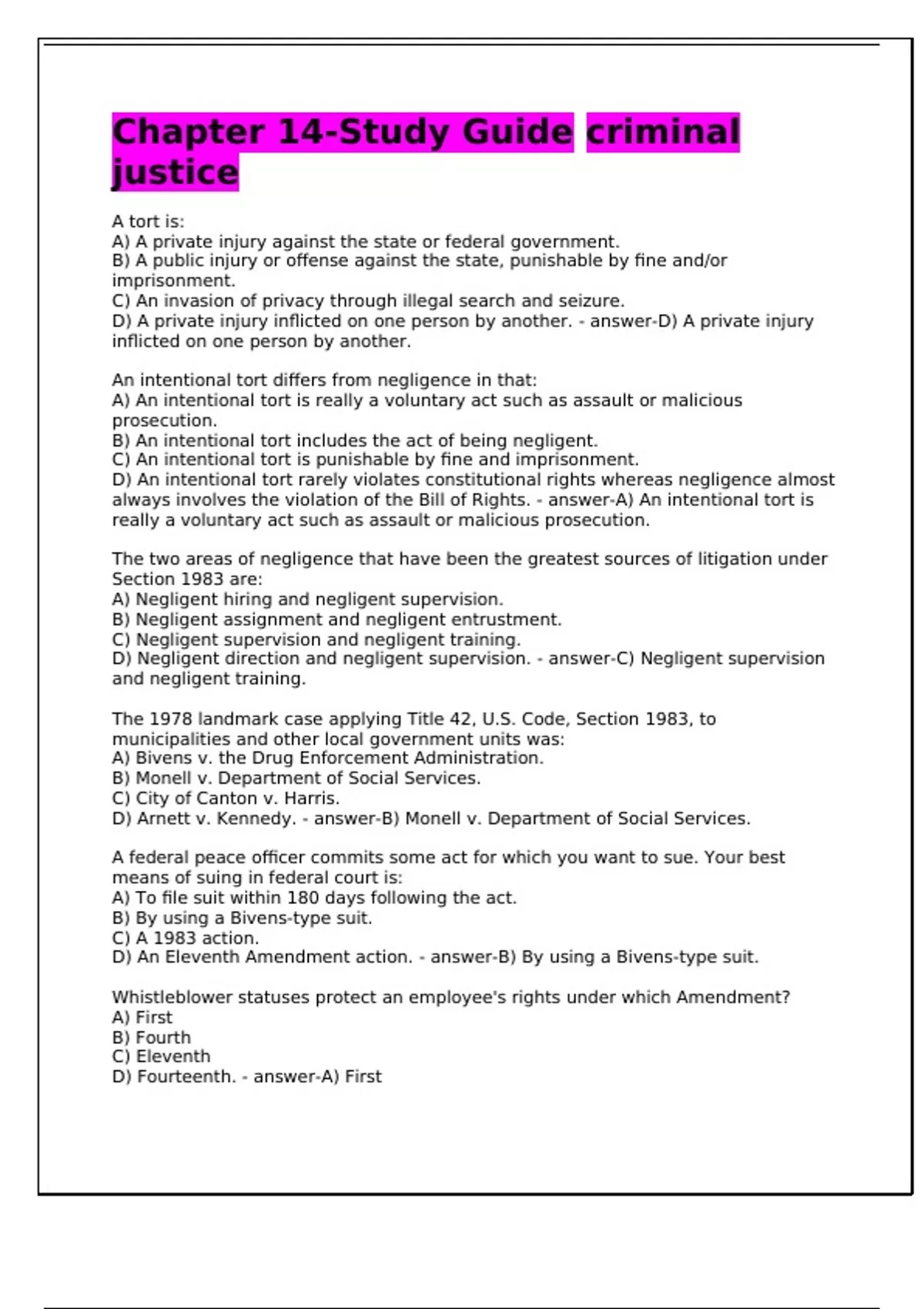 A tort is: A) A private injury against the state or federal government. B) A public injury or offense against the state, punishable by fine and/or imprisonment. C) An invasion of privacy through illegal search and seizure. D) A private injury inflicted on one person by another. - answer-D) A private injury inflicted on one person by another. An intentional tort differs from negligence in that: A) An intentional tort is really a voluntary act such as assault or malicious prosecution. B) An intentional tort includes the act of being negligent. C) An intentional tort is punishable by fine and imprisonment. D) An intentional tort rarely violates constitutional rights whereas negligence almost always involves the violation of the Bill of Rights. - answer-A) An intentional tort is really a voluntary act such as assault or malicious prosecution. The two areas of negligence that have been the greatest sources of litigation under Section 1983 are: A) Negligent hiring and negligent supervision. B) Negligent assignment and negligent entrustment. C) Negligent supervision and negligent training. D) Negligent direction and negligent supervision. - answer-C) Negligent supervision and negligent training. The 1978 landmark case applying Title 42, U.S. Code, Section 1983, to municipalities and other local government units was: A) Bivens v. the Drug Enforcement Administration. B) Monell v. Department of Social Services. C) City of Canton v. Harris. D) Arnett v. Kennedy. - answer-B) Monell v. Department of Social Services. A federal peace officer commits some act for which you want to sue. Your best means of suing in federal court is: A) To file suit within 180 days following the act. B) By using a Bivens-type suit. C) A 1983 action. D) An Eleventh Amendment action. - answer-B) By using a Bivens-type suit. Whistleblower statuses protect an employee's rights under which Amendment? A) First B) Fourth C) Eleventh D) Fourteenth. - answer-A) First The 1985 landmark case the restricted the use of deadly force in effecting an arrest without significant threat of death or serious physical injury to the officer or others was: A) Tennessee v. Garner B) Taylor v. Kelley. C) Monell v. Georgia. D) Bivens v. City of Chicago Police Department. - answer-A) Tennessee v. Garner According to the Supreme Court, before an agency conducts an administrative investigation wherein an issue that may involve disciplinary action against an officer for refusal to answer questions, the agency must: A) Order the officer to answer the questions. B) Ask questions that are specifically related to the officer's duties. C) Advise the officer that answers to questions will not be used against the officer in a criminal proceeding. D) All of the above - answer-D) All of the above These rights have been loosely defined as those involving the protection and defense of one's good name, reputation, and position in the community. A) Liberty. B) Property. C) Substantive. D) Procedural. - answer-A) Liberty. Which of the following is not an area usually covered by police firearms regulations? A