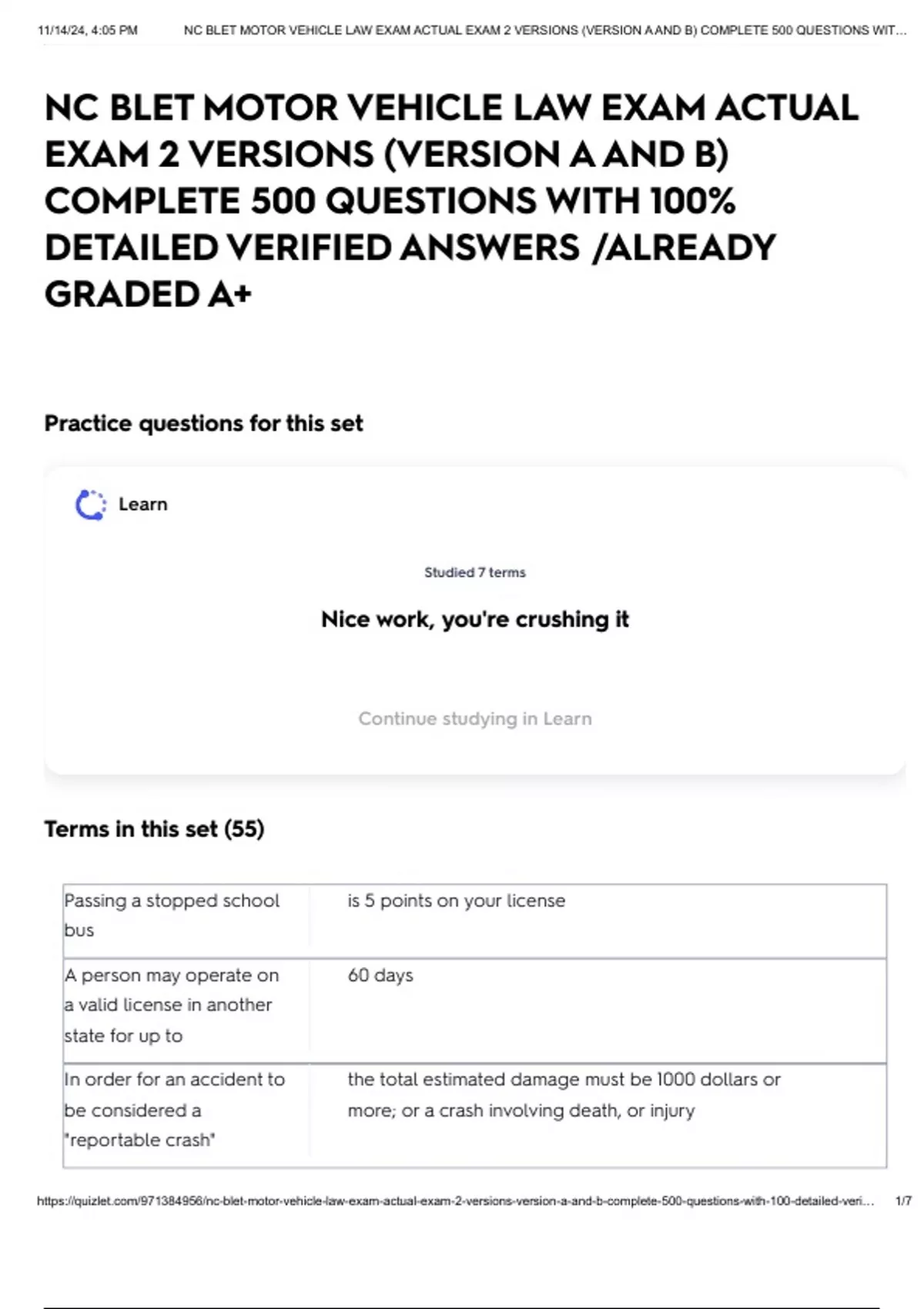 https://quizlet.com/971384956/nc-blet-motor-vehicle-law-exam-actual-exam-2-versions-version-a-and-b-complete-500-questions-with-100-detailed-veri… 1/7