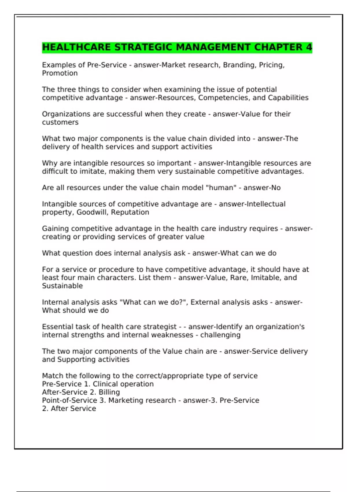 Examples of Pre-Service - answer-Market research, Branding, Pricing, Promotion The three things to consider when examining the issue of potential competitive advantage - answer-Resources, Competencies, and Capabilities Organizations are successful when they create - answer-Value for their customers What two major components is the value chain divided into - answer-The delivery of health services and support activities Why are intangible resources so important - answer-Intangible resources are difficult to imitate, making them very sustainable competitive advantages. Are all resources under the value chain model "human" - answer-No Intangible sources of competitive advantage are - answer-Intellectual property, Goodwill, Reputation Gaining competitive advantage in the health care industry requires - answer-creating or providing services of greater value What question does internal analysis ask - answer-What can we do For a service or procedure to have competitive advantage, it should have at least four main characters. List them - answer-Value, Rare, Imitable, and Sustainable Internal analysis asks "What can we do?", External analysis asks - answer-What should we do Essential task of health care strategist - - answer-Identify an organization's internal strengths and internal weaknesses - challenging The two major components of the Value chain are - answer-Service delivery and Supporting activities Match the following to the correct/appropriate type of service Pre-Service 1. Clinical operation After-Service 2. Billing Point-of-Service 3. Marketing research - answer-3. Pre-Service 2. After Service 1. Point of Service What does the value chain provide - answer-Analysis framework for identifying and focusing on areas in a health care organization where value may be added Supporting activities of the health care value chain - answer-Strategic Resources, Organizational Structure, Organizational Culture CT Scan, The finance department, Shared Values What is an intangible source of competitive advantage - answer-Intellectual Property Give examples of each delivery activity. __Understanding what niche of the market you are focusing on 1. Pre Service __Cutting down on the wait time 2. Point of service ___Contacting consumers to hear about their experience and focusing on ways to improve service 3. After Service - answer-1. Understanding what niche of the market you are focusing on 2. Cutting down on wait time 3. Contacting consumers to hear about their experience and focusing on ways to improve service