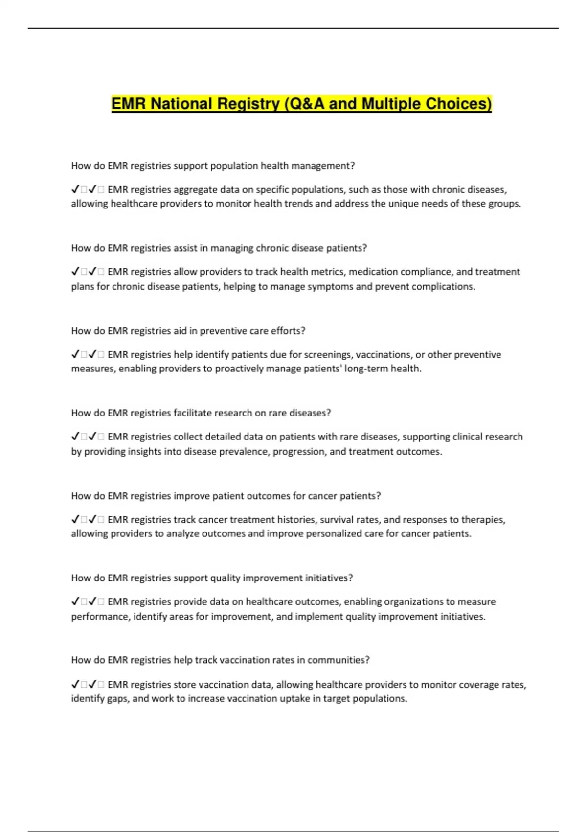EMR National Registry (Q&A and Multiple Choices) How do EMR registries support population health management? ️️ EMR registries aggregate data on specific populations, such as those with chronic diseases, allowing healthcare providers to monitor health trends and address the unique needs of these groups. How do EMR registries assist in managing chronic disease patients? ️️ EMR registries allow providers to track health metrics, medication compliance, and treatment plans for chronic disease patients, helping to manage symptoms and prevent complications. How do EMR registries aid in preventive care efforts? ️️ EMR registries help identify patients due for screenings, vaccinations, or other preventive measures, enabling providers to proactively manage patients' long-term health. How do EMR registries facilitate research on rare diseases? ️️ EMR registries collect detailed data on patients with rare diseases, supporting clinical research by providing insights into disease prevalence, progression, and treatment outcomes. How do EMR registries improve patient outcomes for cancer patients? ️️ EMR registries track cancer treatment histories, survival rates, and responses to therapies, allowing providers to analyze outcomes and improve personalized care for cancer patients. How do EMR registries support quality improvement initiatives? ️️ EMR registries provide data on healthcare outcomes, enabling organizations to measure performance, identify areas for improvement, and implement quality improvement initiatives. How do EMR registries help track vaccination rates in communities? ️️ EMR registries store vaccination data, allowing healthcare providers to monitor coverage rates, identify gaps, and work to increase vaccination uptake in target populations. How do EMR registries assist with early detection of disease outbreaks? ️️ EMR registries analyze patient data for patterns, enabling public health officials to detect disease outbreaks early and implement timely interventions. How do EMR registries support patient stratification for risk management? ️️ EMR registries classify patients based on risk factors, allowing providers to prioritize high-risk patients for proactive interventions and targeted care. How do EMR registries facilitate continuity of care across providers? ️️ EMR registries allow providers from different facilities to access a patient’s full health history, promoting seamless transitions and continuity in patient care. How do EMR registries assist in monitoring compliance with treatment guidelines? ️️ EMR registries track adherence to established treatment guidelines, helping providers ensure consistency in care and adherence to evidence-based practices. How do EMR registries contribute to reducing healthcare costs? ️️ EMR registries support preventive care, reduce hospital readmissions, and minimize redundant tests, collectively leading to more efficient care and reduced healthcare costs. How do EMR registries support tracking and managing patients with multiple comorbidities? ️️ EMR registries provide a comprehensive overview of patients with multiple conditions, enabling providers to coordinate care and avoid conflicting treatments. How do EMR registries improve patient engagement in self-care? ️️ EMR registries provide patients with access to their health data, empowering them to take an active role in managing their health and adhering to treatment plans. How do EMR registries assist in public health reporting and surveillance? ️️ EMR registries compile population health data, enabling healthcare organizations to report trends, track health metrics, and respond to public health challenges. How do EMR registries aid in identifying gaps in healthcare access? ️️ EMR registries analyze data across demographics, helping healthcare providers identify disparities in access and implement initiatives to improve healthcare equity. How do EMR registries improve tracking of patient follow-up appointments? ️️ EMR registries alert providers about upcoming follow-ups, helping ensure that patients receive timely post-treatment evaluations and ongoing care. How do EMR registries support coordinated care for patients undergoing rehabilitation? ️️ EMR registries store data on patient progress, enabling providers involved in rehabilitation to track improvements and adjust therapy plans accordingly. How do EMR registries help healthcare providers monitor mental health trends? ️️ EMR registries collect data on mental health diagnoses, treatments, and outcomes, allowing providers to monitor trends and address emerging mental health needs in populations. How do EMR registries facilitate genomic research and personalized medicine? ️️ EMR registries store genetic information and health data, supporting research that tailors treatments to individuals based on genetic profiles and personalized care plans. How do EMR registries aid in tracking long-term treatment outcomes? ️️ EMR registries monitor treatment outcomes over extended periods, helping providers understand the effectiveness of treatments and adjust protocols as necessary. How do EMR registries support early intervention for high-risk pregnancies? ️️ EMR registries track health data for expectant mothers with risk factors, enabling providers to implement early interventions and improve maternal and neonatal outcomes. How do EMR registries assist in managing healthcare resources effectively? ️️ EMR registries provide insights on patient volumes and needs, allowing healthcare facilities to allocate resources effectively and reduce bottlenecks in patient care. How do EMR registries enhance clinical trials recruitment? ️️ EMR registries identify patients who meet specific eligibility criteria, facilitating recruitment for clinical trials and contributing to faster, more effective research studies. How do EMR registries support adherence to reporting re