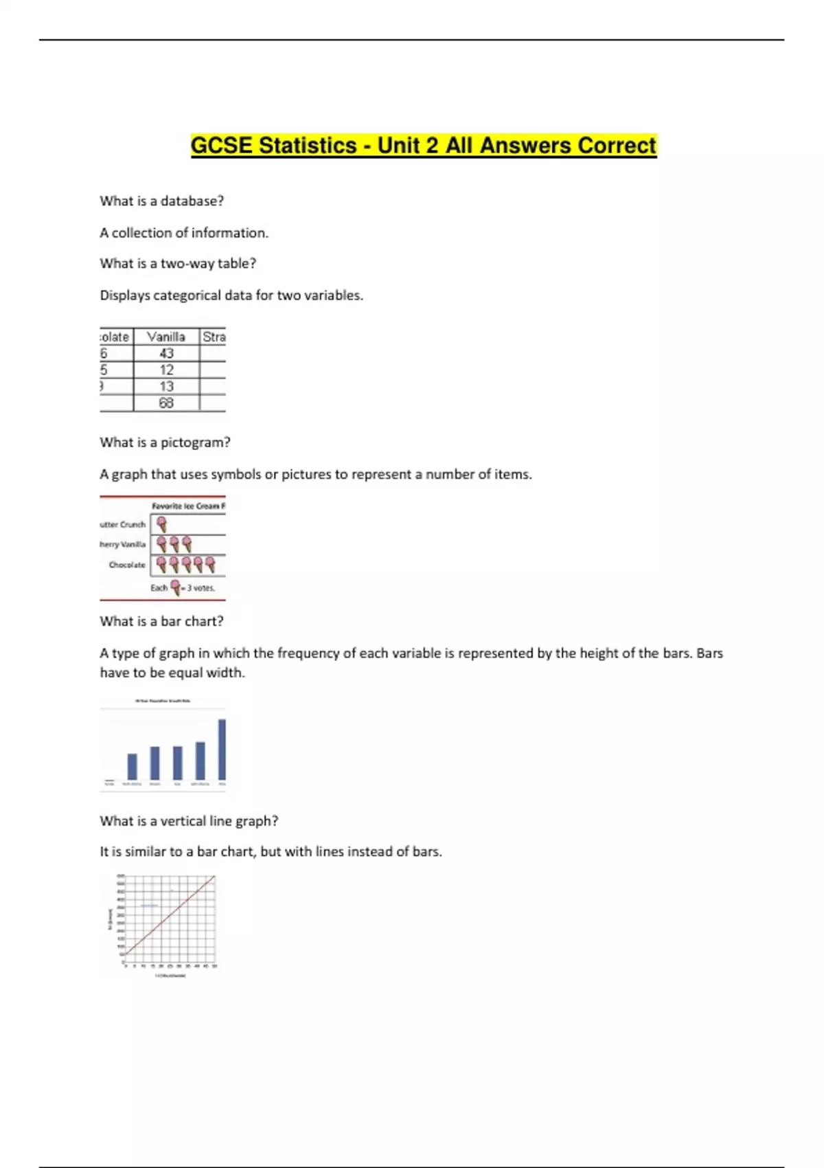 GCSE Statistics - Unit 2 All Answers Correct What is a database? A collection of information. What is a two-way table? Displays categorical data for two variables. What is a pictogram? A graph that uses symbols or pictures to represent a number of items. What is a bar chart? A type of graph in which the frequency of each variable is represented by the height of the bars. Bars have to be equal width. What is a vertical line graph? It is similar to a bar chart, but with lines instead of bars. What is a multiple bar chart? A bar chart with more than one bar for each class. What is a composite bar chart? A bar chart that groups several bars into one. What is a stem and leaf diagram? A graph showing numerical data split into a stem and leaves. What is a pie chart? A way of displaying data when you want to show how something is shared or divided. What is a comparative pie chart? A pie chart used to compare two sets of data with different total frequencies. What is a population pyramid? A bar graph representing the distribution of population by age and sex. What is a choropleth map? A diagram/map used to classify regions of a geographical area. What is a histogram? Similar to a bar graph but for continuous data so without spaces between bars. What does frequency density = ? frequency / class width What is a frequency polygon? Graphic depiction that uses a line to represent the distribution of frequencies that can be drawn with or without a histogram. What type of data is used for cumulative frequency step polygons? Discrete What type of data is used for cumulative frequency diagrams? Continuous What are the three types of distribution? Symmetrical, positive skew and negative skew. What can make a diagram misleading? If it is 3D, does not have clear scales, labels or key, the source is not obvious, the scale does not start at 0 or does not increase uniformly.