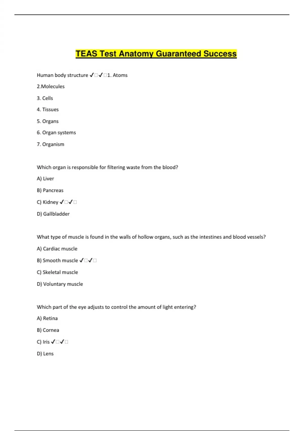 TEAS Test Anatomy Guaranteed Success Human body structure ️️1. Atoms 2.Molecules 3. Cells 4. Tissues 5. Organs 6. Organ systems 7. Organism Which organ is responsible for filtering waste from the blood? A) Liver B) Pancreas C) Kidney ️️ D) Gallbladder What type of muscle is found in the walls of hollow organs, such as the intestines and blood vessels? A) Cardiac muscle B) Smooth muscle ️️ C) Skeletal muscle D) Voluntary muscle Which part of the eye adjusts to control the amount of light entering? A) Retina B) Cornea C) Iris ️️ D) Lens The primary function of the pulmonary veins is to: A) Carry oxygenated blood from the lungs to the heart ️️ B) Transport deoxygenated blood to the lungs C) Regulate blood pressure D) Deliver nutrients to body tissues Which part of the brain is involved in controlling heart rate, breathing, and blood pressure? A) Cerebellum B) Medulla oblongata ️️ C) Cerebrum D) Thalamus Which structure in the digestive system prevents acid reflux? A) Pyloric sphincter B) Cardiac sphincter ️️ C) Ileocecal valve D) Epiglottis Where does gas exchange primarily occur in the respiratory system? A) Trachea B) Bronchi C) Alveoli ️️ D) Bronchioles Which layer of the skin contains sweat glands and hair follicles? A) Epidermis B) Dermis ️️ C) Hypodermis D) Subcutaneous layer The function of red bone marrow is to: A) Store minerals B) Produce blood cells ️️ C) Protect organs D) Produce energy What structure in the male reproductive system is responsible for producing sperm? A) Vas deferens B) Seminal vesicles C) Prostate gland D) Testes ️️ Which vitamin is essential for calcium absorption in the intestines? A) Vitamin A B) Vitamin C C) Vitamin D ️️ D) Vitamin K The purpose of the endocrine system is to: A) Control voluntary movements B) Filter waste from the blood C) Produce hormones to regulate body processes ️️ D) Break down food What is the basic functional unit of the nervous system? A) Synapse B) Axon C) Neuron ️️ D) Dendrite Which enzyme is primarily responsible for breaking down carbohydrates in the mouth? A) Pepsin B) Lipase C) Amylase ️️ D) Trypsin The heart's natural pacemaker is located in the: A) Right ventricle B) Aorta C) Sinoatrial (SA) node ️️ D) Left atrium Which blood vessels are responsible for the exchange of nutrients and gases with body tissues? A) Arteries B) Veins C) Capillaries ️️ D) Lymph vessels What part of the brain is associated with memory and learning? A) Cerebellum B) Medulla oblongata C) Hippocampus ️️ D) Pons Which organ is responsible for producing most of the digestive enzymes? A) Stomach B) Small intestine C) Liver D) Pancreas ️️ What protein in the skin provides its elasticity and strength? A) Hemoglobin B) Keratin C) Melanin D) Collagen ️️ Epithelial Tissue ️️-Provides covering (skin) or produce secretions -No blood supply -Squamous, cuboidal, and columnar Connective Tissue ️️-Connects different structures of the body -Own blood supply, except a few like ligaments -Bone, cartilage, adipose (fat), and blood vessel Muscle Tissue ️️-Produces movement -Skeletal: supports voluntary movement -Smooth: involuntary control -Cardiac: involuntary, only in the heart Nervous Tissue ️️-Provides structure for the brain, spinal cord, and