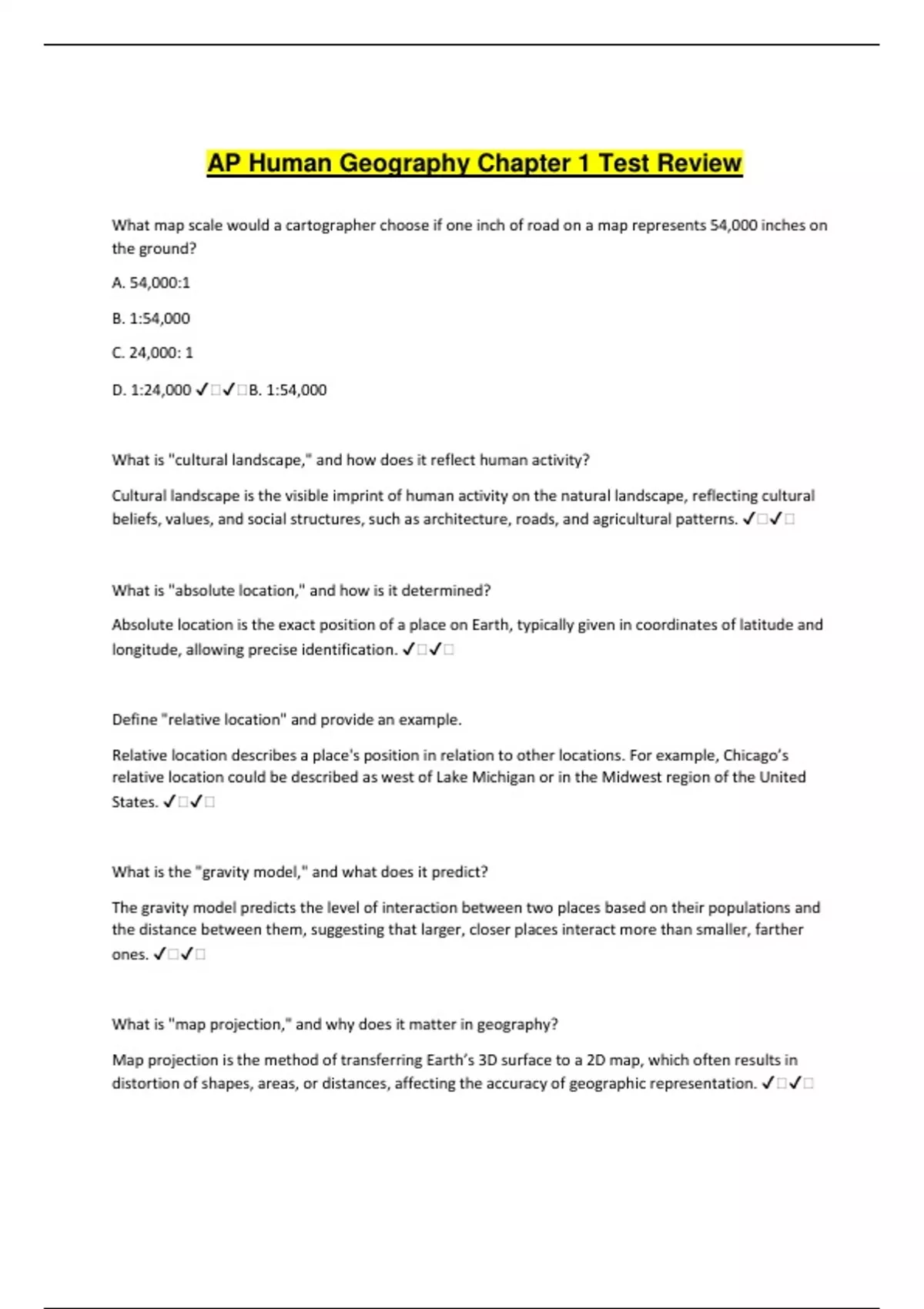 AP Human Geography Chapter 1 Test Review What map scale would a cartographer choose if one inch of road on a map represents 54,000 inches on the ground? A. 54,000:1 B. 1:54,000 C. 24,000: 1 D. 1:24,000 ️️B. 1:54,000 What is "cultural landscape," and how does it reflect human activity? Cultural landscape is the visible imprint of human activity on the natural landscape, reflecting cultural beliefs, values, and social structures, such as architecture, roads, and agricultural patterns. ️️ What is "absolute location," and how is it determined? Absolute location is the exact position of a place on Earth, typically given in coordinates of latitude and longitude, allowing precise identification. ️️ Define "relative location" and provide an example. Relative location describes a place's position in relation to other locations. For example, Chicago’s relative location could be described as west of Lake Michigan or in the Midwest region of the United States. ️️ What is the "gravity model," and what does it predict? The gravity model predicts the level of interaction between two places based on their populations and the distance between them, suggesting that larger, closer places interact more than smaller, farther ones. ️️ What is "map projection," and why does it matter in geography? Map projection is the method of transferring Earth’s 3D surface to a 2D map, which often results in distortion of shapes, areas, or distances, affecting the accuracy of geographic representation. ️️ What is "ethnocentrism," and how can it affect geographic perception? Ethnocentrism is the belief in the superiority of one's own culture, which can shape perceptions and biases toward other regions, potentially leading to misunderstandings and cultural stereotypes. ️️ What is the purpose of a "remote sensing" technology in geography? Remote sensing technology captures images and data from satellites or aircraft to monitor environmental changes, track land use, and assess natural disasters, providing valuable geographic information. ️️ Explain "location" in the context of geography and its significance. Location refers to the specific position of a place on Earth’s surface, playing a crucial role in understanding spatial relationships, accessibility, and the interaction between places. ️️ What is "population density," and how is it calculated? Population density is the measure of people per unit area, calculated by dividing the population by the area. It helps indicate how crowded or sparsely populated a region is. ️️ What does "pattern" refer to in spatial analysis? Pattern in spatial analysis refers to the arrangement or distribution of objects in space, whether regular, clustered, or random, which can reveal important insights into geographic processes. ️️ Define "formal region" and provide an example. A formal region is an area defined by a shared physical or cultural trait, like a country with specific political boundaries or the Corn Belt in the United States known for agricultural production. ️️ What is the significance of "latitude" and "longitude" in geography?