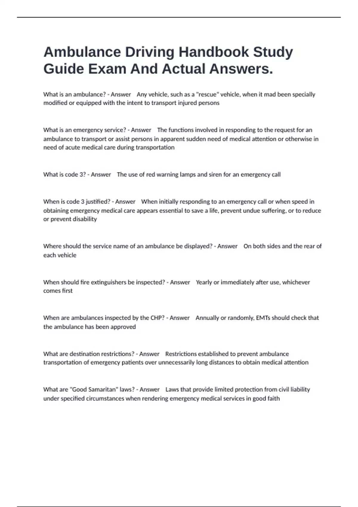 Ambulance Driving Handbook Study Guide Exam And Actual Answers.