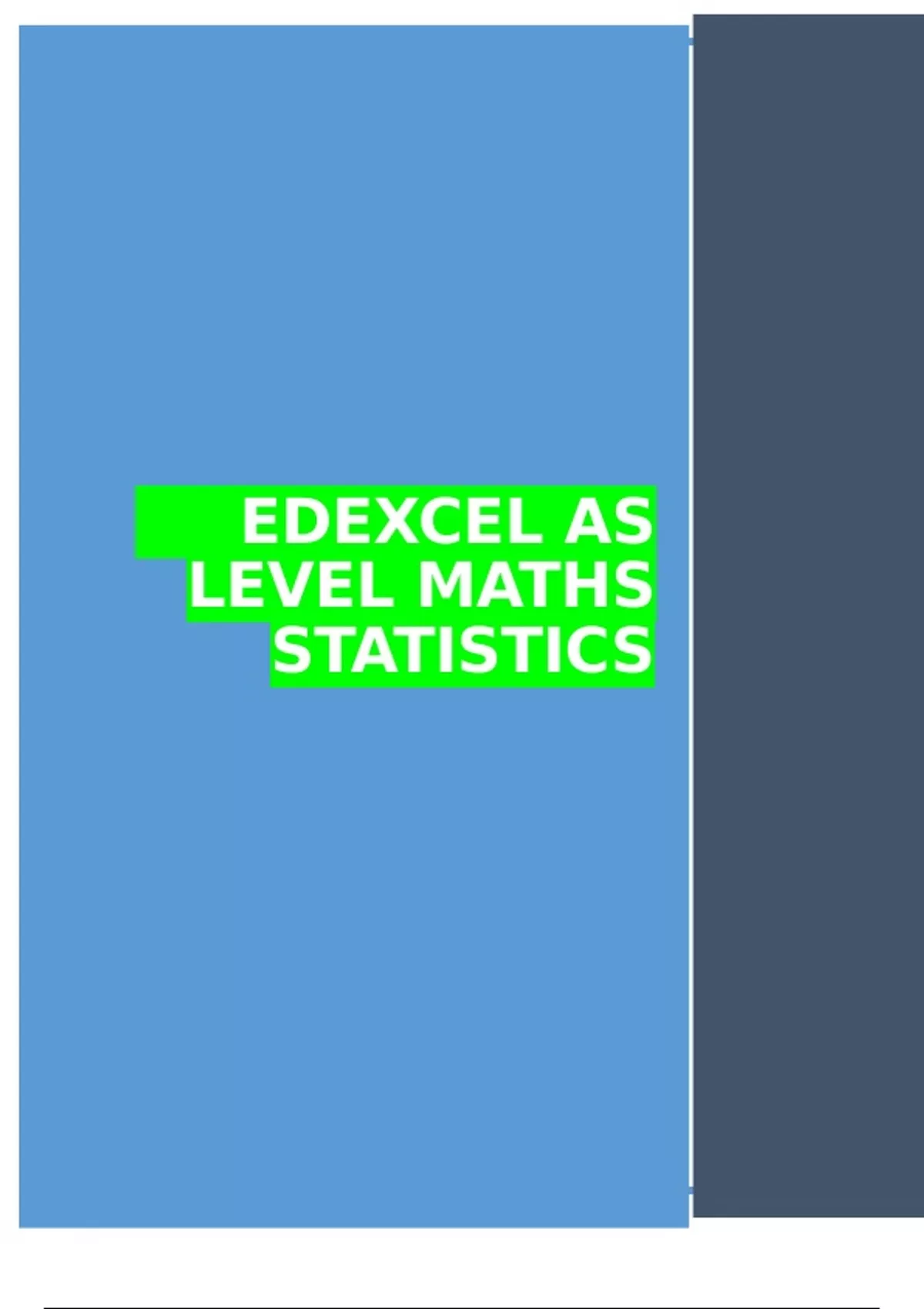 Advantages of a census - answer-It should give a completely accurate result Advantages of a sample - answer-Less time consuming Fewer people have to respond Less data than a census Advantages of Opportunity Sampling - answer-Easy to carry out Inexpensive Advantages of Quota Sampling - answer-Allows a small sample to still represent the whole population No sampling frame required Quick, easy and inexpensive Allows for easy comparison between different groups in the population Advantages of Simple Random Sample - answer-Free of bias Easy and cheap to implement Each sampling unit has equal chance of selection Advantages of Stratified Sampling - answer-Population must clearly classified into distinct strata Advantages of Systematic Sampling - answer-Simple and quick to use Suitable for large samples alternative hypothesis - answer-Tells us about the parameter if your assumption is wrong binomial distribution - answer-When there are a fixed number of trials There are 2 possible outcomes (success or failure) There is a fixed probability of success The trials are independent of each other bivariate data - answer-Data which has pairs of values for two variables Census - answer-Observes or measures every member of a population Class Boundaries - answer-The maximum and minimum values that belong in each class Class Width - answer-The difference between the upper and lower class boundaries Cleaning the data - answer-The process of removing anomalies from a data set. Continuous Variable - answer-A variable that can take any value in a given range Correlation - answer-A measure of the linear relationship between two variables critical region - answer-the area in the tails of the comparison distribution in which the null hypothesis can be rejected Disadvantage of a census - answer-Time consuming and expensive Hard to process large quantity of data Disadvantage of a sample - answer-The data may not be as accurate The data may not be large enough toggle information about the population Disadvantage of Simple Random Sample - answer-A sampling frame is needed Not suitable when the population size is very big Disadvantages of Opportunity Sampling - answer-Unlikely to provide a representative sample Highly dependent on individual researcher Disadvantages of Quota Sampling - answer-Not random sampling can produce bias Population must be divided into groups which can be costly or inaccurate Non-responces are recorded as such Disadvantages of Stratified Sampling - answer-Sample accuracy reflects the population structure guarantees proportional representation of groups within a population Disadvantages of Systematic Sampling - answer-A sampling frame is needed It can intro