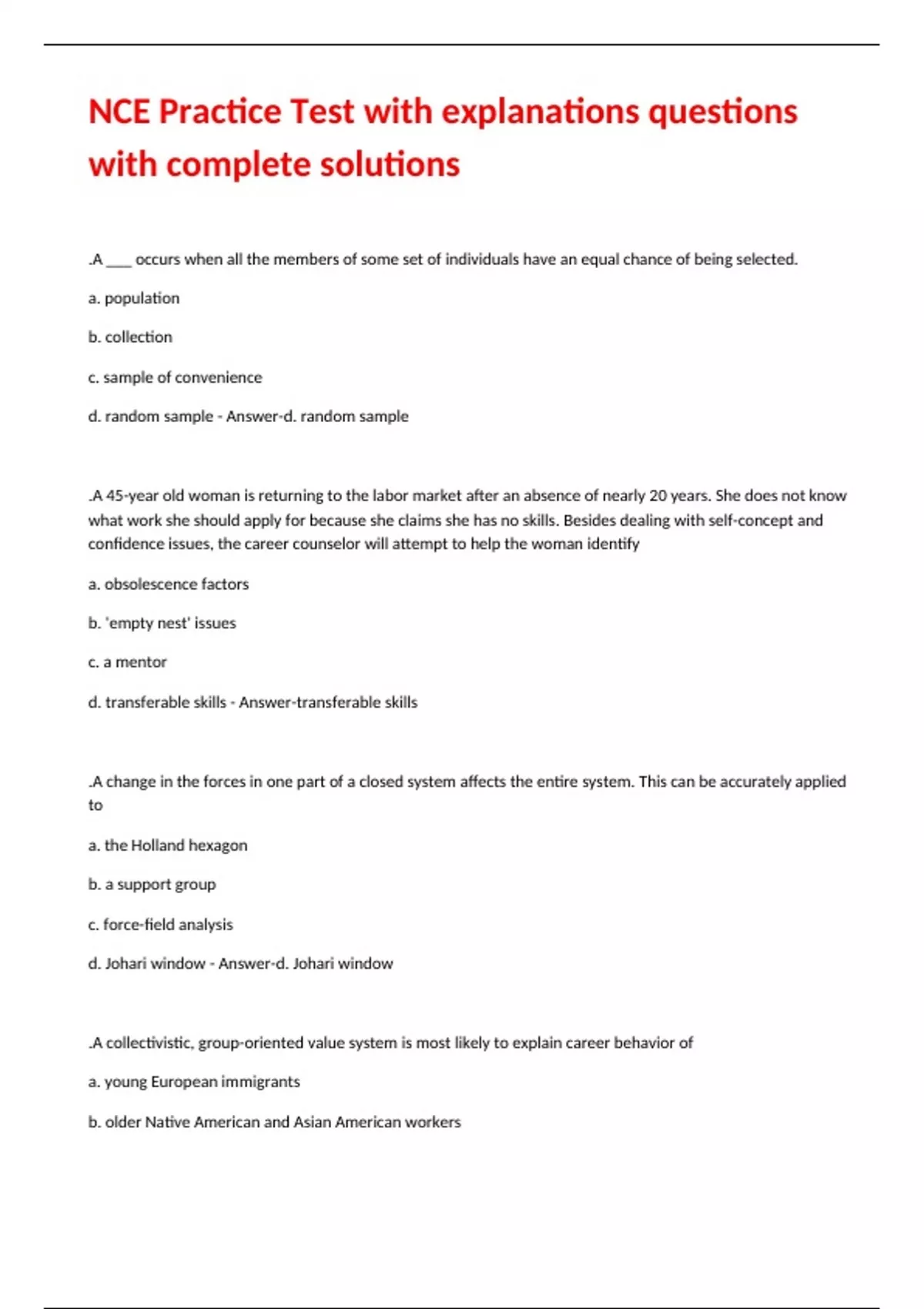 NCE Practice Test with explanations questions with complete solutions .A ___ occurs when all the members of some set of individuals have an equal chance of being selected. a. population b. collection c. sample of convenience d. random sample - Answer-d. random sample .A 45-year old woman is returning to the labor market after an absence of nearly 20 years. She does not know what work she should apply for because she claims she has no skills. Besides dealing with self-concept and confidence issues, the career counselor will attempt to help the woman identify a. obsolescence factors b. 'empty nest' issues c. a mentor d. transferable skills - Answer-transferable skills .A change in the forces in one part of a closed system affects the entire system. This can be accurately applied to a. the Holland hexagon b. a support group c. force-field analysis d. Johari window - Answer-d. Johari window .A collectivistic, group-oriented value system is most likely to explain career behavior of a. young European immigrants b. older Native American and Asian American workers c. middle-aged white males d. young and professionally trained white women - Answer-b. older Native American and Asian American workers .A counseling group begins with ten individuals. By the end of the third session, two members have dropped. One of the remaining members knows of an individual who would like to join the group. The member asks the group leader if this is possible and he tells her no. It is likely that this is a __ group. a. closed b. homogeneous c. working d. structured - Answer-a. closed .A counselor educator at a large university studied different counseling modalities for students who came to the counseling center with relationship/self-esteem problems. There was a waiting list to accommodate all the students. As a researcher, he was curious whether men or women gained self-esteem differentially whether they were seen in individual counseling, group counseling, or small psychoeducational class (18 to 20 students). There was also a possibility of an interaction between gender and the kind of service they received. The appropriate statistical technique to use in this situation was a. one-way analysis of variance b. factorial analysis of variance c. t-test d. multivariate analysis of variance - Answer-factorial analysis of variance .A counselor educator gave the same final exam to two classes studying human growth and development. In Class A, the final exam scores were normally distributed and in Class B there was definite negative skew in exam results. The counselor educator would be correct in making the following statement. a. More students mastered the material in Class A than Class B b. The mean, median, and mode are the same for Class A students c. Over 50% of students in Class A scored higher than the mean d. a different final exam should be used in each class - Answer-b. The mean, median, and mode are the same for Class A students .A counselor is about to begin a short-term group for whom generating insight is NOT an issue. The counselor is most likely to choose a. psychoanalytical or TA approaches b. behavioral or reality approaches c. client-centered or gestalt approaches d. adlerian or cognitive approaches - Answer-b. behavioral or reality approaches .A counselor performs pre-marital counseling in conjunction with a church whose pastor refers couples to her. Ordinarily, the counselor sees the couple together twice, two times individually, and twice together again for a total of six sessions. In her second individual session with Tom, the counselor learns that he has not broken off an affair with another woman, not his prospective marriage partner. An appropriate counselor response is to a. insist Tom tell his future wife b. remind Tom of their agreement there would be no secrets c. refer the couple to a more experienced pre-marital counselor d. decide to provide Tom more individual counseling sessions - Answer-remind Tom of their agreement there would be no secrets .A doctoral student is curious about how bilingual kindergarten children interact verbally with monolingual children of a different racial group. She decides to study this for her doctoral research. A research method which may be most appropriate to consider is a. ethnographic b. experiemental c. analogue d. survey - Answer-Ethnographic .A group of individuals completed two assessment devices. The correlation between the two sets of scores was .81. An accurate interpretation of that correlation coefficient is a. the higher the individuals scored on tone test, the lower they scored on the other. b. the individuals scored high on both tests, or they scored low on both tests c. scoring high on one test caused the high score on the other test. d. an accurate interpretation cannot be made - Answer-b. the individuals scored high on both tests, or they scored low on both tests .A high school career counselor had 24 seniors sign up for a three-session job seeking skills workshop. He randomly assigned 12 students to the job seeking group and 12 to a control group. The counselor developed some new materials and techniques to be used by the 'experimental' group. In designing this study, the counselor was also concerned about a. providing a placebo experience to the control group b. the Hawthorne effect c. confidentiality d. the halo effect - Answer-Providing a placebo experience to the control group .A high school counselor specializes in assisting graduating seniors to get into their college of choice with the best possible chance for financial aid. Which of the following counselor activities is NOT unethical? a. providing old copies of standardized tests b. outlining essays which students will send to colleges c. calling college financial aid officers on behalf of students d. suggesting parents 'doctor' tax statements to increase financial aid eligibility - Answer-c. calling college financial aid officers on behalf of students .A licensed professional coun