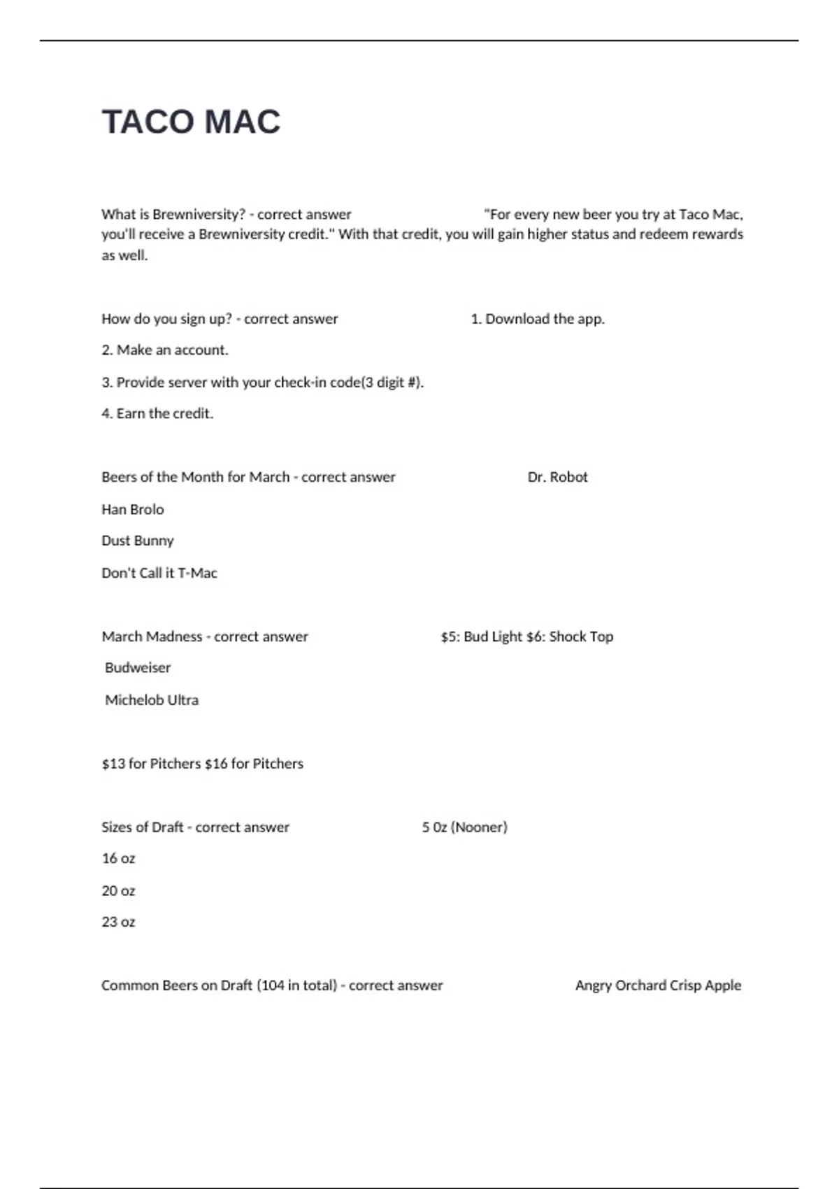 What is Brewniversity? - correct answer "For every new beer you try at Taco Mac, you'll receive a Brewniversity credit." With that credit, you will gain higher status and redeem rewards as well. How do you sign up? - correct answer 1. Download the app. 2. Make an account. 3. Provide server with your check-in code(3 digit #). 4. Earn the credit. Beers of the Month for March - correct answer Dr. Robot Han Brolo Dust Bunny Don't Call it T-Mac March Madness - correct answer $5: Bud Light $6: Shock Top Budweiser Michelob Ultra $13 for Pitchers $16 for Pitchers Sizes of Draft - correct answer 5 0z (Nooner) 16 oz 20 oz 23 oz Common Beers on Draft (104 in total) - correct answer Angry Orchard Crisp Apple Arches Triboulet Bell's Hopslam Blue Moon White Bracket Sweetwater G13 Bracket Tropicalia Bud Bud Light Coors Light Corona Light Creatures Comfort (Athens, Rec Rye, Tropic) Dos Equis Lager Harpoon IPA Heineken Jekyll Hop Dang Diggity Jekyll Pony Ride Miller Lite Modelo Especial Monday Night Slap Fight Samuel Adams (Cold Snap, Lager, NE IPA) Scofflaw (Basement IPA, Hooligan) Sweetwater (420, G13 IPA, Hop Hash Easy, IPA) Terrapin (Hopsecutioner, Luau Krunk) Yuengling Amber Lager Appetizers - correct answer Queso (Small or Large) Guac (Small or Large) Chips and Salsa Queso con Carne Spinach Dip Three Pointer (Mozzarella Sticks, Onion Rings, Fried Pickles) Mozzarella Sticks Jumbo Pretzel and Beer Cheese Fried Calamari Grilled Chicken or Steak Nachos Nachos all the Way (chili, black beans, pico de gallo, beef, jalapeños, queso, guac, 7 cheeses, sour cream) Served with salsa. Tater Toppers (Buffalo Chicken, Chili Cheese, Bacon Chicken Ranch) Flatbreads - correct answer Buffalo Chicken Pepperoni and Four Cheese BBQ Chicken Wing Flavors (Original, Roasted, Boneless) - correct answer 1. Slow Burn 2. Death Sauce 3. Three Mile Island (TMI) 4. Habanero BBQ 5. Mild 6. Medium 7. Hot (Buffalo) 8. Honey Chipotle 9. Sweet Baby Rays 10.Sweet Chili Sesame 11. Parmesan Garlic Dry Rubs 12. Lemon Pepper 13. Korean Black Garlic 14. Chili Mango Burgers - correct answer 1. Bacon Cheddar Ranch (Bacon, Cheddar Cheese, Ranch, Tomato, Lettuce) 2. The Original (Lettuce, Tomato, Red Onion) 3. Black Bean (Guac, Lettuce, Tomato) 4. Buffalo (Buffalo sauce, Blue Cheese crumbles, lettuce, tomato, onion) 5. Hickory (Bacon, 7 cheeses, Sweet Baby Rays Sauce) 6. Mushroom Steak Burger(Mushrooms, Bacon, Swiss, A1 sauce, Mayo) 7. Original Turkey (Lettuce, Tomato, Onion) 8. The Kenmore (Bacon, Mushrooms and Onions, Swiss, Ketchup, Mustard, Mayo) Classic Dishes - correct answer Tenders (Grilled or Fried) Buffalo Tenders (Fried) Fish and Chips Skillet Salmon (Served with Roasted Parm Zucchini) Served with a side. Quesadillas - correct answer Chicken Steak Vegetables and Black Beans Tacos (Three-Of-a-Kind) - correct answer Classic Street Chicken Fajita Steak Fajita Grilled Shrimp and Mango Beer-Battered Fish Tacos Buffalo Chicken Tacos (Fried) Served with a side. Salads - correct answer 1. Monterey Chicken Salad 2. Buffalo Chicken 3. Caesar(Chicken or Shrimp) 4. Cobb 5. Shrimp Avocado and Mango Side (Caesar, House, Wedge) Salad Dressings - correct answer Ranch Buffalo Ranch Bleu Cheese Honey Mustard Balsamic Vinaigrette Sandwiches ("Wrap it Up") - correct answer 1. Chicken Avocado & Bacon (Grilled or Fried) 2. Buffalo Chicken (Grilled or Fried) 3. The Hollywood (Grilled or Fried) 4. South Street Philly (Steak or Chicken, ADD ON mushrooms) *Served on either a brioche bun or a hoagie roll.* ALSO served with a side AND Pickle. Wraps - correct answer 1. Grilled Chicken Ranch 2. Shrimp Guac and Mango