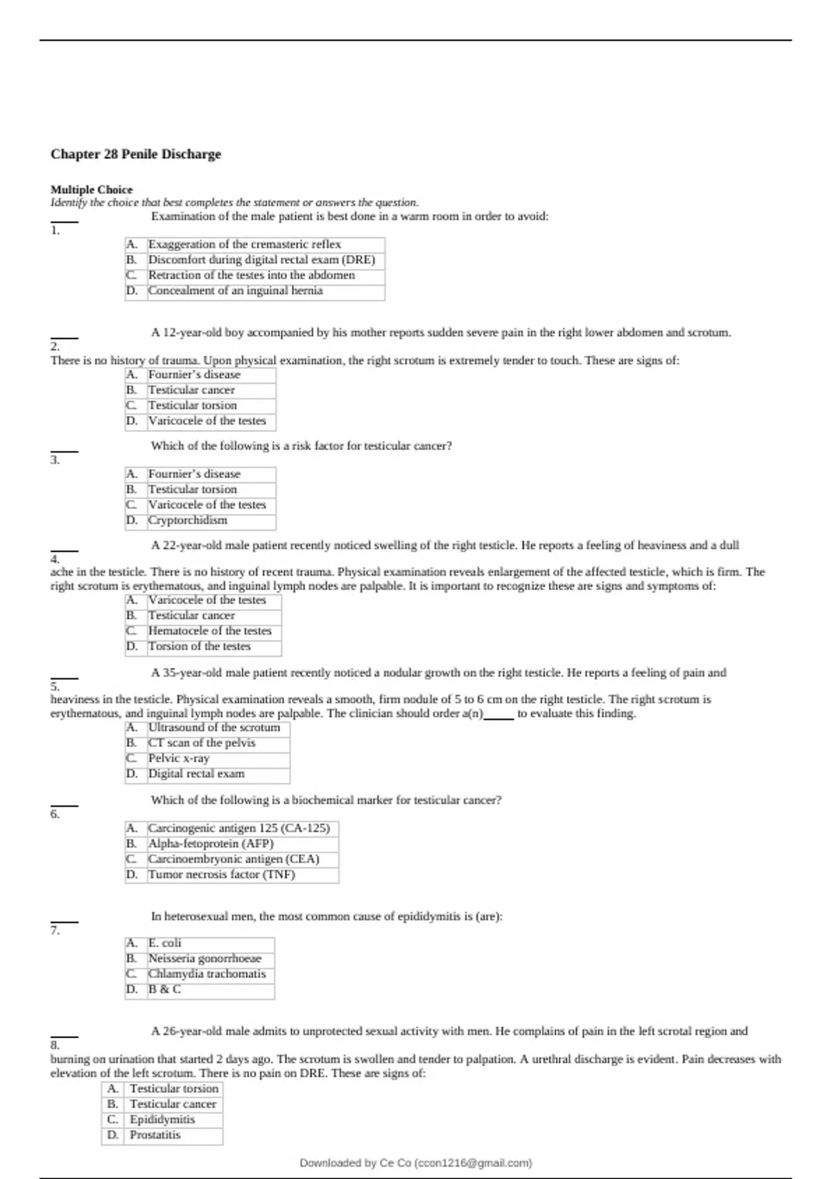 ache in the testicle. There is no history of recent trauma. Physical examination reveals enlargement of the affected testicle, which is firm. The