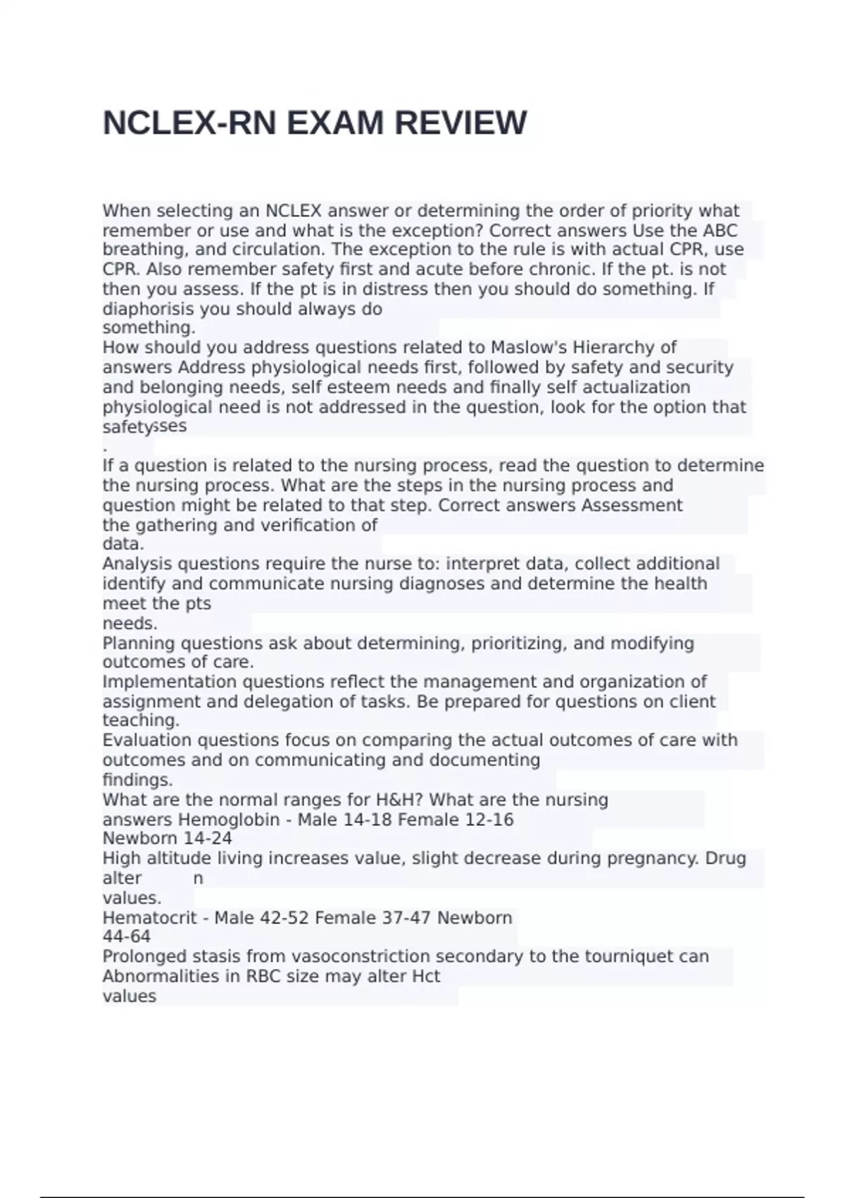 When selecting an NCLEX answer or determining the order of priority what should you remember or use and what is the exception? Correct answers Use the ABC rule: Airway breathing, and circulation. The exception to the rule is with actual CPR, use C-A-B for CPR. Also remember safety first and acute before chronic. If the pt. is not in distress then you assess. If the pt is in distress then you should do something. If the pt has diaphorisis you should always do something. How should you address questions related to Maslow's Hierarchy of Needs Correct answers Address physiological needs first, followed by safety and security needs, love and belonging needs, self esteem needs and finally self actualization needs. *When a physiological need is not addressed in the question, look for the option that addresses safety. If a question is related to the nursing process, read the question to determine the step of the nursing process. What are the steps in the nursing process and what kind of question might be related to that step. Correct answers Assessment question address the gathering and verification of data. Analysis questions require the nurse to: interpret data, collect additional information, identify and communicate nursing diagnoses and determine the health team's ability to meet the pts needs. Planning questions ask about determining, prioritizing, and modifying outcomes of care. Implementation questions reflect the management and organization of care and the assignment and delegation of tasks. Be prepared for questions on client teaching. Evaluation questions focus on comparing the actual outcomes of care with the expected outcomes and on communicating and documenting findings. What are the normal ranges for H&H? What are the nursing implications Correct answers Hemoglobin - Male 14-18 Female 12-16 Newborn 14-24 High altitude living increases value, slight decrease during pregnancy. Drug therapy can alter values. Hematocrit - Male 42-52 Female 37-47 Newborn 44-64 Prolonged stasis from vasoconstriction secondary to the tourniquet can alter values. Abnormalities in RBC size may alter Hct values
