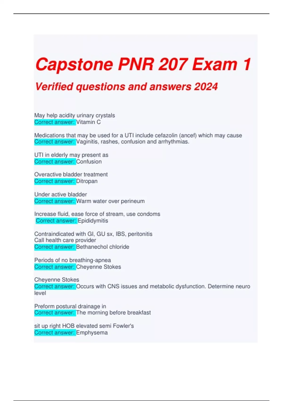 Capstone PNR 207 Exam 1 Verified questions and answers 2024 May help acidity urinary crystals Correct answer: Vitamin C Medications that may be used for a UTI include cefazolin (ancef) which may cause Correct answer: Vaginitis, rashes, confusion and arrhythmias. UTI in elderly may present as Correct answer: Confusion Overactive bladder treatment Correct answer: Ditropan Under active bladder Correct answer: Warm water over perineum Increase fluid, ease force of stream, use condoms Correct answer: Epididymitis Contraindicated with GI, GU sx, IBS, peritonitis Call health care provider Correct answer: Bethanechol chloride Periods of no breathing-apnea Correct answer: Cheyenne Stokes Cheyenne Stokes Correct answer: Occurs with CNS issues and metabolic dysfunction. Determine neuro level Preform postural drainage in Correct answer: The morning before breakfast sit up right HOB elevated semi Fowler's Correct answer: Emphysema should bubble with respirations Correct answer: Chest tube Guaifenesin (Robitussin) should be taken with a Correct answer: a glass of water to loosen mucus and secretions in lungs COPD patients O2 administer Correct answer: 2-3 liters safety Correct answer: O2 conservation TB at risk populations Correct answer: children under 5, individuals living in crowded areas, subway riders and malnourished individuals TB medications Correct answer: (R.I.P.E.) Rifampin Isoniazid (INH) Pyrazinamide Ethambutol Rifampin side effects Correct answer: Red orange sweat, urine, tears, feces. Stains contacts. Give on empty stomach Ethambutol side effects Correct answer: Watch liver enzymes BUN levels Correct answer: 10-20 mg/dL Creatine levels Correct answer: 0.6-1.2 mg/dL pH Correct answer: 7.35-7.45 PaC02 Correct answer: 35-45 mm Hg HC03 (bicarbonate) Correct answer: 22-26 mEq/L Potassium levels Correct answer: 3.5-5.0 mEq/L Sodium levels Correct answer: 135-145 mEq/L Hemoglobin levels Correct answer: 12-18 g/dL Female 12-16 g/dL Male 14-18 g/dL Hematocrit levels Correct answer: 36%-54% Female 36%-48% Male 39%-54% Platelet’s count Correct answer: 150,000-400,000/mm3 INR (not on warfarin) Correct answer: 0.8-1.1 INR (on warfarin) Correct answer: 2-3 seconds Assistive Correct answer: devices should be encouraged (safety) Immunocompromised Correct answer: Wash hands, hand sanitizer, no acrylic nails, maintain skin integrity Diabetes Correct answer: Protect from infection Common Nsg DX Alt Skin Integrity Maintain HA1C 4-6% Diet encouraged for cardiac pt