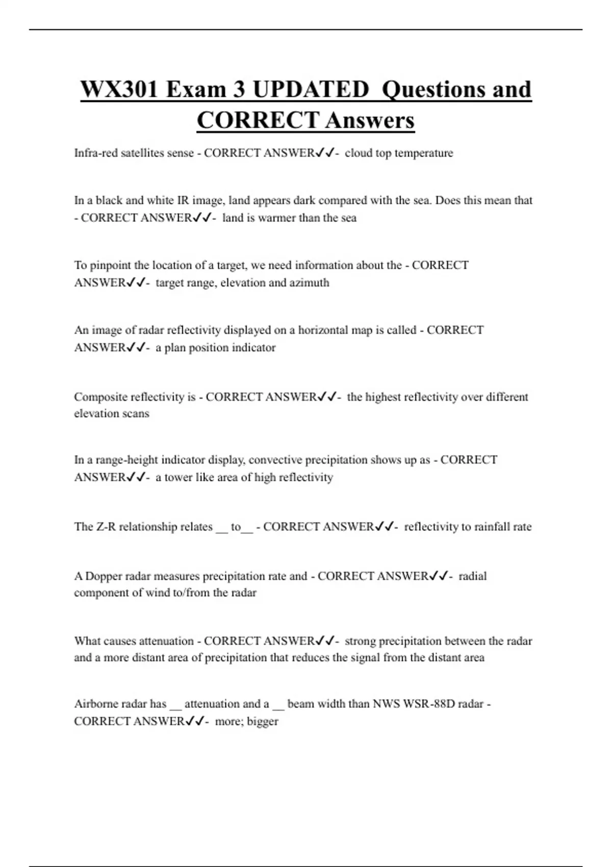 X301 Exam 3 UPDATED Questions and CORRECT Answers Infra-red satellites sense - CORRECT ANSWER- cloud top temperature In a black and white IR image, land appears dark compared with the sea. Does this mean that - CORRECT ANSWER- land is warmer than the sea To pinpoint the location of a target, we need information about the - CORRECT ANSWER- target range, elevation and azimuth