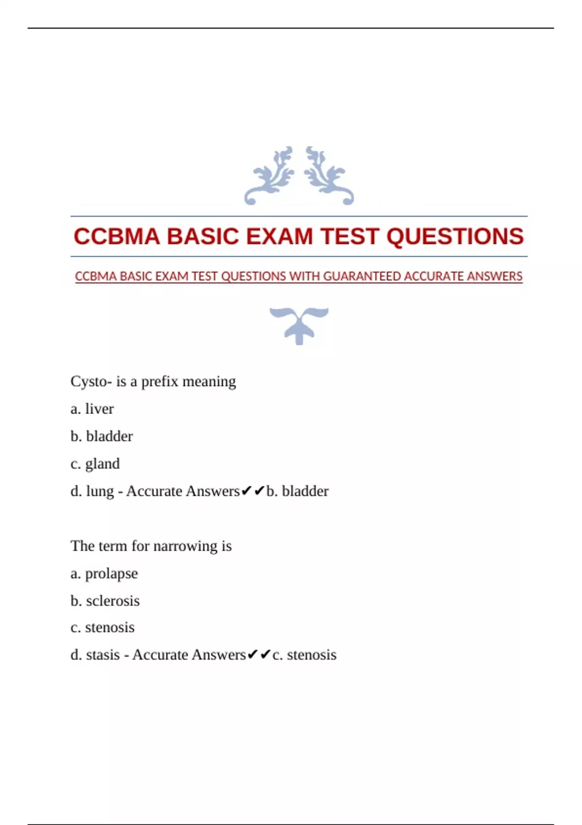 CCBMA BASIC EXAM TEST QUESTIONS WITH GUARANTEED ACCURATE ANSWERS