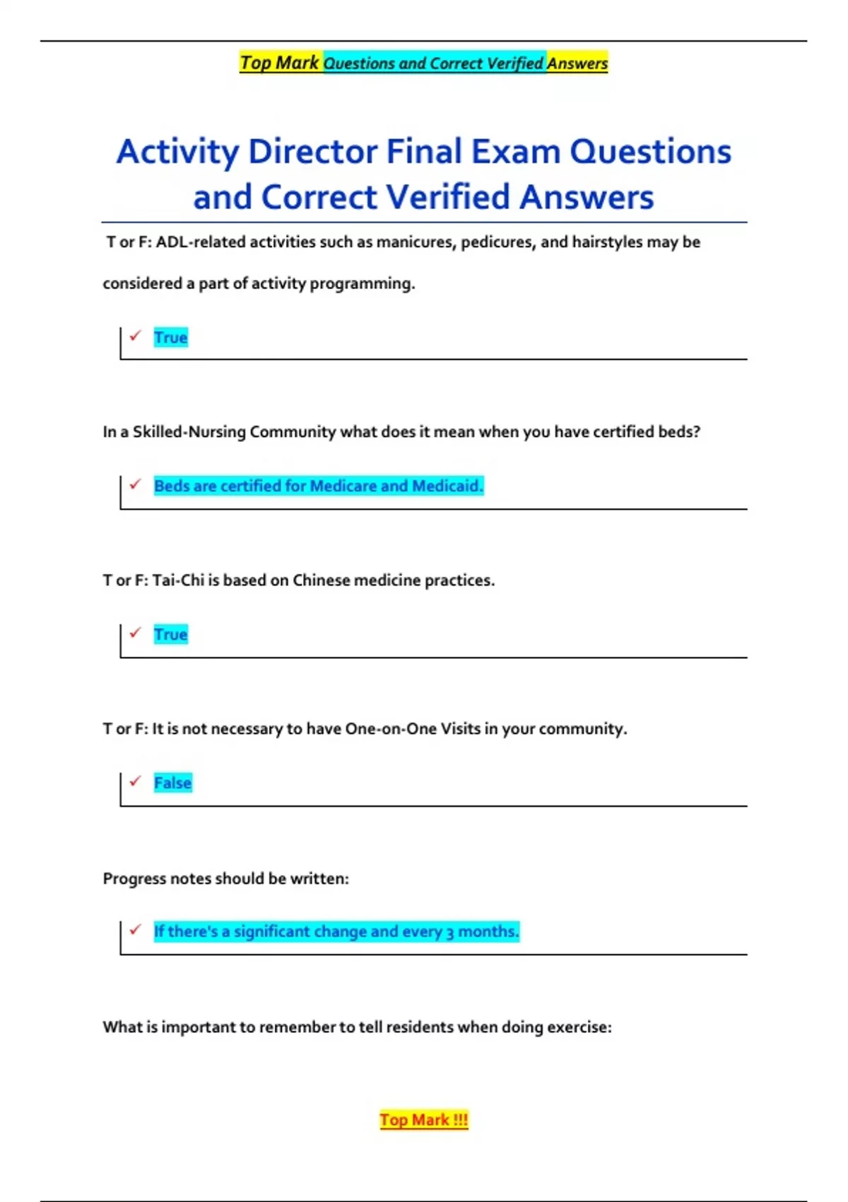 T or F: ADL-related activities such as manicures, pedicures, and hairstyles may be considered a part of activity programming. True In a Skilled-Nursing Community what does it mean when you have certified beds? Beds are certified for Medicare and Medicaid. T or F: Tai-Chi is based on Chinese medicine practices. True T or F: It is not necessary to have One-on-One Visits in your community. False Progress notes should be written: If there's a significant change and every 3 months. What is important to remember to tell residents when doing exercise: Top Mark Questions and Correct Verified Answers Top Mark !!! No pain, no pain. T or F: It is important to allow room for wheelchairs when doing activities. True AL, SNF, MCU, and CCRC are examples of levels of __________: Care When leading an art program it is important to have: A completed example What is important when doing activities for seniors? Balance How should you seat residents during activities? According to their functioning level What are good tools for marketing? Picture