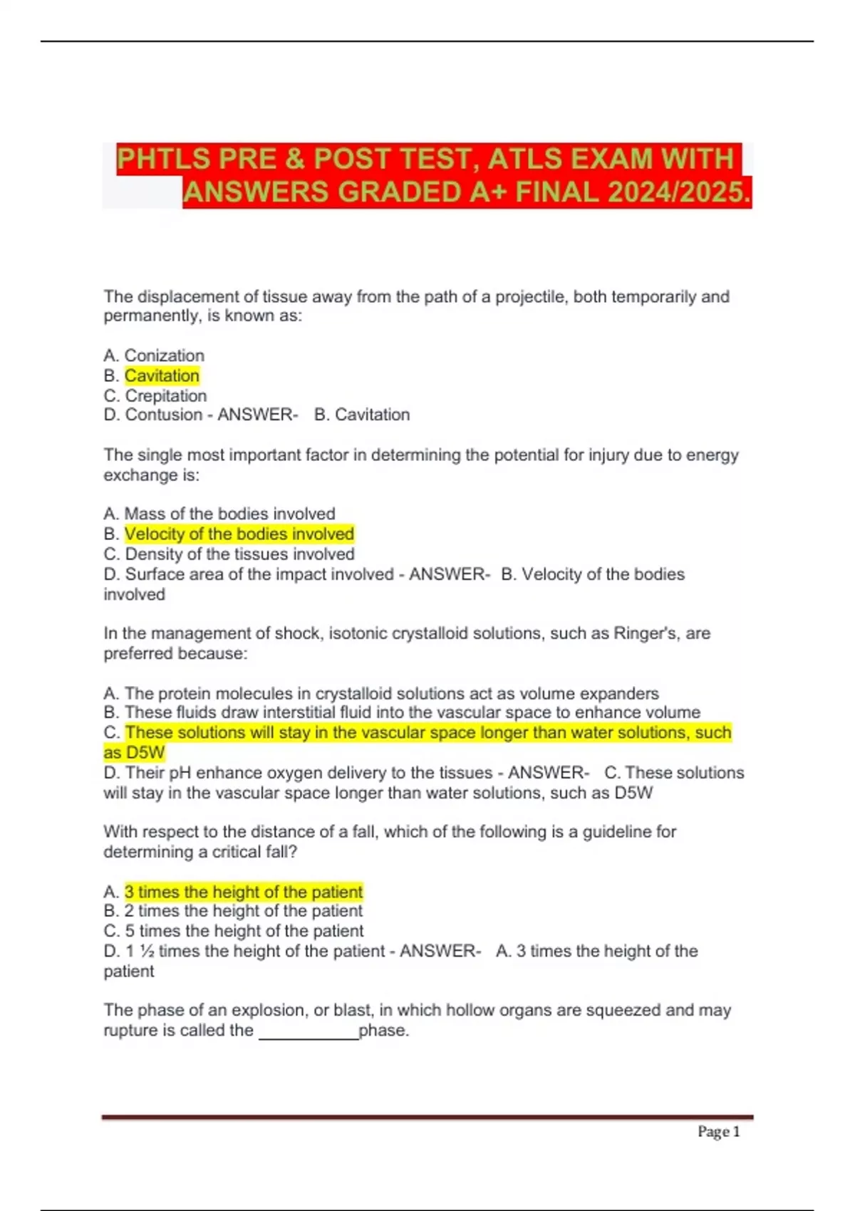PHTLS PRE & POST TEST, ATLSEXAMWITHANSWERS GRADEDA+ FINAL2024/2025The displacement of tissue away from the path of a projectile, both temporarilyandpermanently, is known as: A. Conization B. Cavitation C. Crepitation D. Contusion - ANSWER- B. Cavitation The single most important factor in determining the potential for injury due toenergyexchange is: A. Mass of the bodies involved B. Velocity of the bodies involved C. Density of the tissues involved D. Surface area of the impact involved - ANSWER- B. Velocity of the bodies involved In the management of shock, isotonic crystalloid solutions, such as Ringer's, arepreferred because: A. The protein molecules in crystalloid solutions act as volume expanders B. These fluids draw interstitial fluid into the vascular space to enhance volumeC. These solutions will stay in the vascular space longer than water solutions, suchas D5W D. Their pH enhance oxygen delivery to the tissues - ANSWER- C. Thesesolutionswill stay in the vascular space longer than water solutions, such as D5WWith respect to the distance of a fall, which of the following is a guideline for determining a critical fall? A. 3 times the height of the patient B. 2 times the height of the patient C. 5 times the height of the patient D. 1 ½ times the height of the patient - ANSWER- A. 3 times the height of thepatient The phase of an explosion, or blast, in which hollow organs are squeezed andmayrupture is called the phase. Page2A. Tertiary phase B. Quaternary phase C. Secondary phase D. Primary phase - ANSWER- D. Primary phase During the primary survey and management of a trauma patient, the E in ABCDEstands for ? A. Edema B. Eyes & ears C. Expose/Environment D. Electrical therapy - ANSWER- C. Expose/Environment The time in which surgical intervention can make a difference in patient outcomeisthe ? A. Golden period B. Golden time C. Golden era D. Golden minutes - ANSWER- A. Golden period (hour) In the absence of extenuating circumstances, the maximum amount of timeit shouldtake to identify and manage immediate threats to life, prepare the patient for transport and begin transport is ? A. 5 minutes B. 10 minutes C. 15 minutes D. 30 minutes - ANSWER- B. 10 minutes In which of the following situations is the use of a short spinal immobilizationdeviceindicated? A. 28 year old male, unrestrained driver in a frontal impact crash. Awake, asksrepeatedly what happened, complains of a headache, has a hematoma on hisforehead. BP 122/84, HR 92, VR 20. B. 40 year old female who was pushed down a flight of stairs and is lying proneonthe landing between two flights of stairs, complaining of back pain. BP118/78, HR100, VR 20. C. 17 year old female, restrained driver in a frontal impact crash. Awake, paleanddiaphoretic, complains of upper right quadrant abdominal pain. BP 100/70, HR108, VR 20. D. None of the above - ANSWER- D. None of the above Your patient is a 32 year old man, restrained driver of a vehicle that has beeninvolved in a frontal impact with a concrete bridge abutment. The patient is awake, but has difficulty answering questions due to shortness of breath. His ventilatoryrateis 30 per minute. Of the following choices, when is the first time the patient's breathsounds should be checked? Page3A. As soon as he is removed from the vehicle B. Prior to being removed from the vehicle C. As soon as he is immobilized on a long backboard D. Enroute to the trauma center - ANSWER- B. Prior to being removed fromthevehicle Which of the following represents adequate s