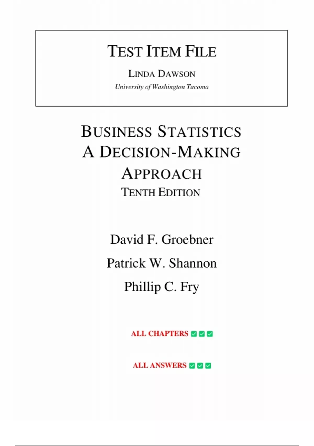Test Bank for Business Statistics: A Decision-Making Approach 10th Edition (Groebner, 2017), Chapter 1-20 | All Chapters.