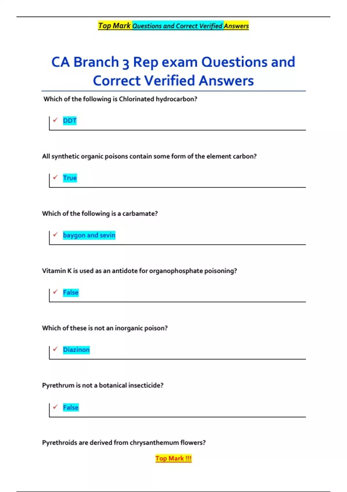 Which of the following is Chlorinated hydrocarbon? DDT All synthetic organic poisons contain some form of the element carbon? True Which of the following is a carbamate? baygon and sevin Vitamin K is used as an antidote for organophosphate poisoning? False Which of these is not an inorganic poison? Diazinon Pyrethrum is not a botanical insecticide? False Pyrethroids are derived from chrysanthemum flowers? Top Mark Questions and Correct Verified Answers Top Mark !!! False Repellent insecticides are undetectable to insects? False Which of the following is an organophosphate? chlorpyrifos Pyrethroids have long residual properties? False Which of the following is not an anticoagulant? Malathion Fipronil and Imidacloprid are repellent insecticides? False Anticoagulants cause internal bleeding? True Atropine is used as an antidote for anti-coagulants Top Mark Questions and Correct Verified Answers Top Mark !!! False Name two botanical insecticides? Pyrethrum, Rotenone, Nicotine, Orange oil, Rosemary Oil, peppermint oil, oil of wintergreen, clove oil, and thyme oil. Insect growth regulator's will stop adult fleas and roaches from laying more eggs? False Which of these is a synergist and is commonly use with perithrums and perithroids? Pipernoyl butoxide and MGK 264 Wettable powders completely dissolve in water and do not need frequent agitation? False