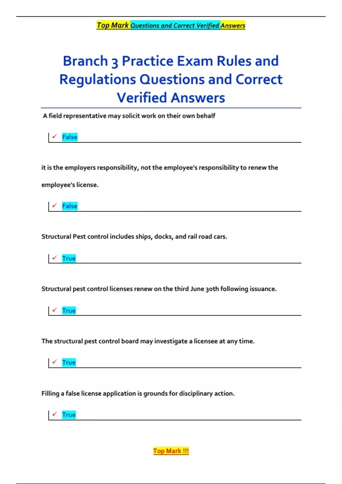 A field representative may solicit work on their own behalf False it is the employers responsibility, not the employee's responsibility to renew the employee's license. False Structural Pest control includes ships, docks, and rail road cars. True Structural pest control licenses renew on the third June 30th following issuance. True The structural pest control board may investigate a licensee at any time. True Filling a false license application is grounds for disciplinary action. True Top Mark Questions and Correct Verified Answers Top Mark !!! Eye protection only has to be worn if the table specifies its use. False If your uniform is clean at the end of the day, it may be worn again without washing. False An employee may be issued a violation and fine if they do not wear the safety equipment the has been provided to them. True All branch 3 Termite repairs must conform to local building codes. True The county agricultural commissioner has the authority to suspend a company's ability to work in their county for up to 3 days. True