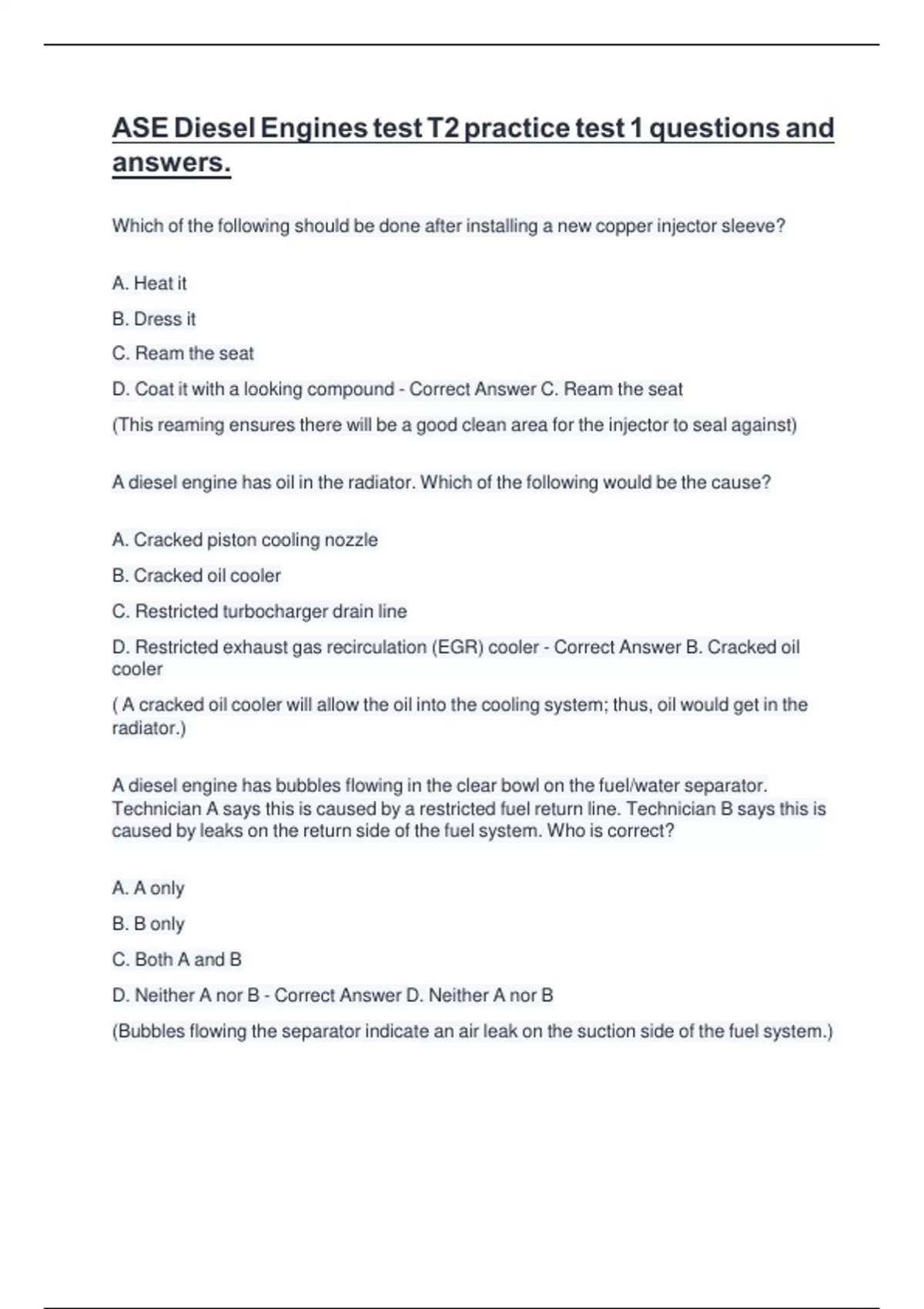ASE DieselEngines test T2practice test 1questions and answers. Which of the following should be done after installing a new copper injector sleeve? A. Heat it B. Dress it C. Ream the seat D. Coat it with a looking compound - Correct Answer C. Ream the seat (This reaming ensures there will be a good clean area for the injector to seal against) A diesel engine has oil in the radiator. Which of the following would be the cause? A. Cracked piston cooling nozzle B. Cracked oil cooler C. Restricted turbocharger drain line D. Restricted exhaust gas recirculation (EGR) cooler - Correct Answer B. Cracked oil cooler ( A cracked oil cooler will allow the oil into the cooling system; thus, oil would get in the radiator.) A diesel engine has bubbles flow