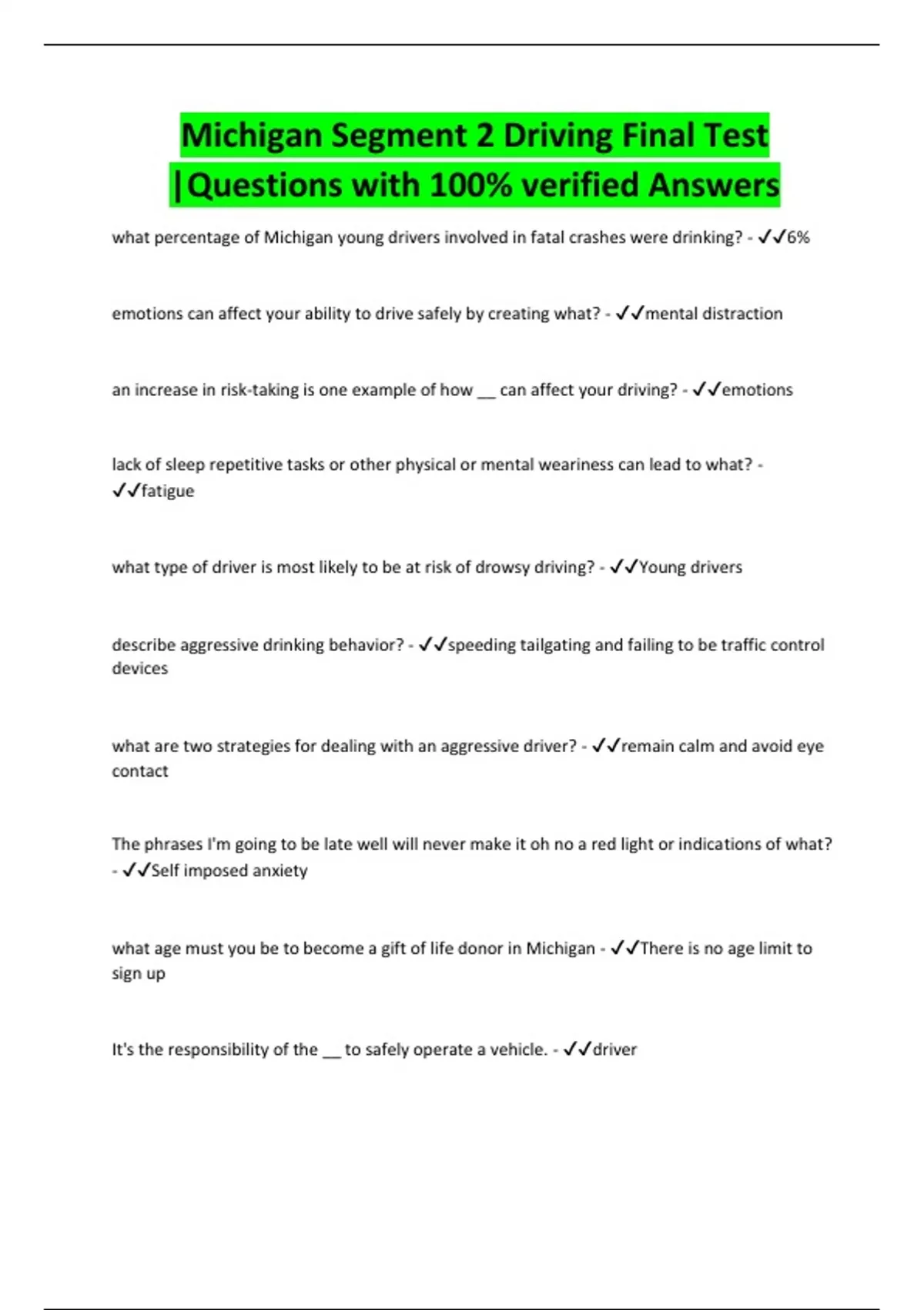 Michigan Segment 2 Driving Final Test |Questions with 100% verified Answers