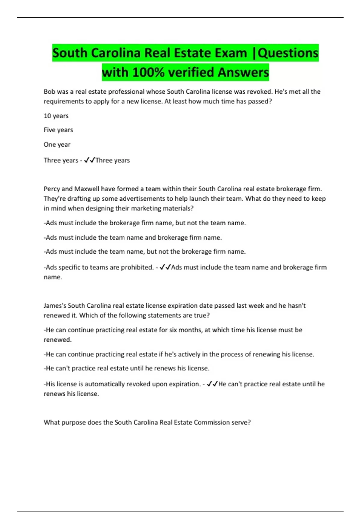 South Carolina Real Estate Exam |Questions with 100% verified Answers