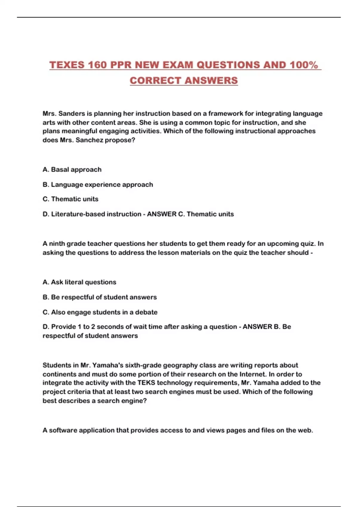 TEXES 160 PPR NEW EXAM QUESTIONS AND 100%