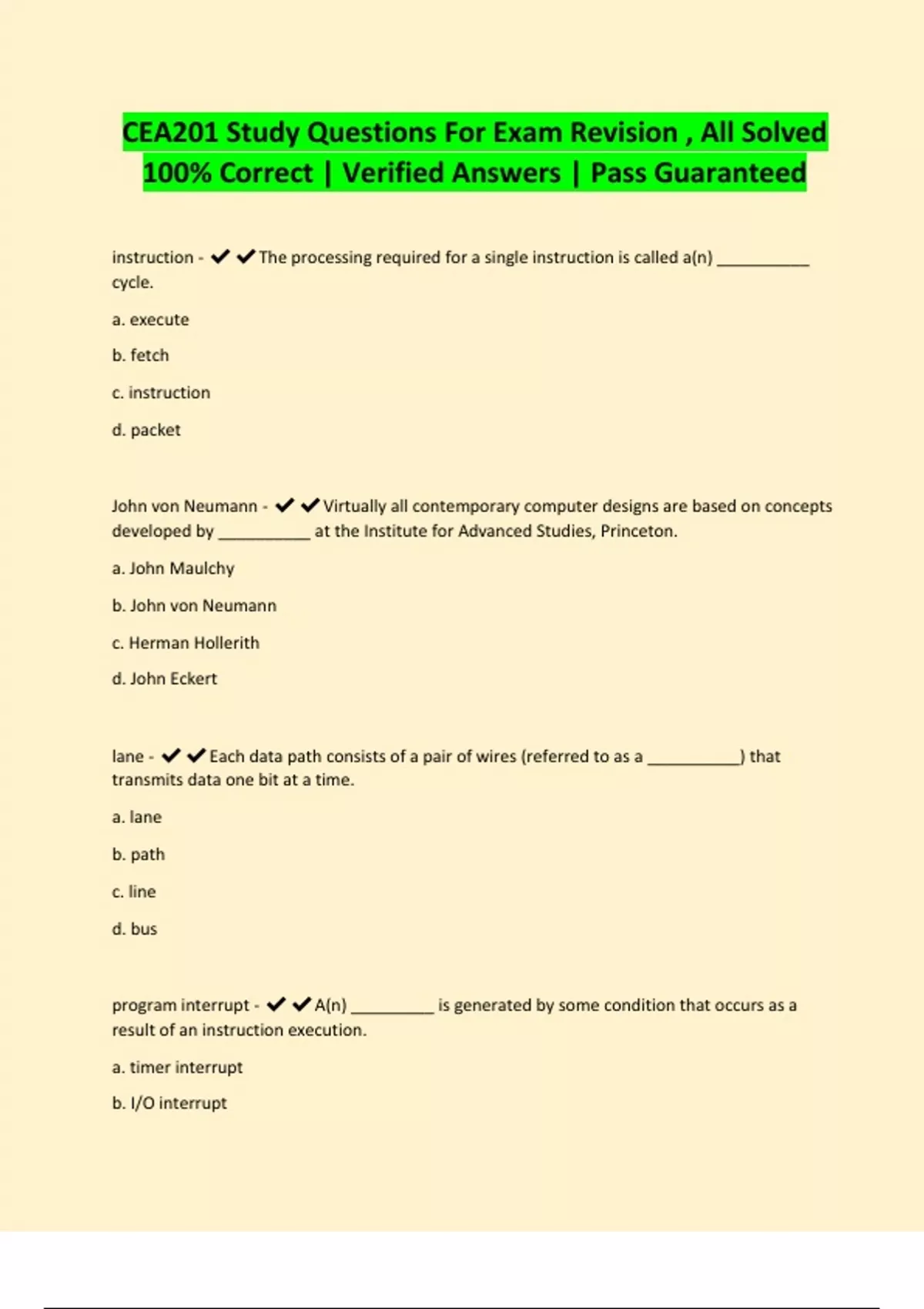 CEA201 Study Questions For Exam Revision , All Solved 100% Correct | Verified Answers | Pass Guaranteed