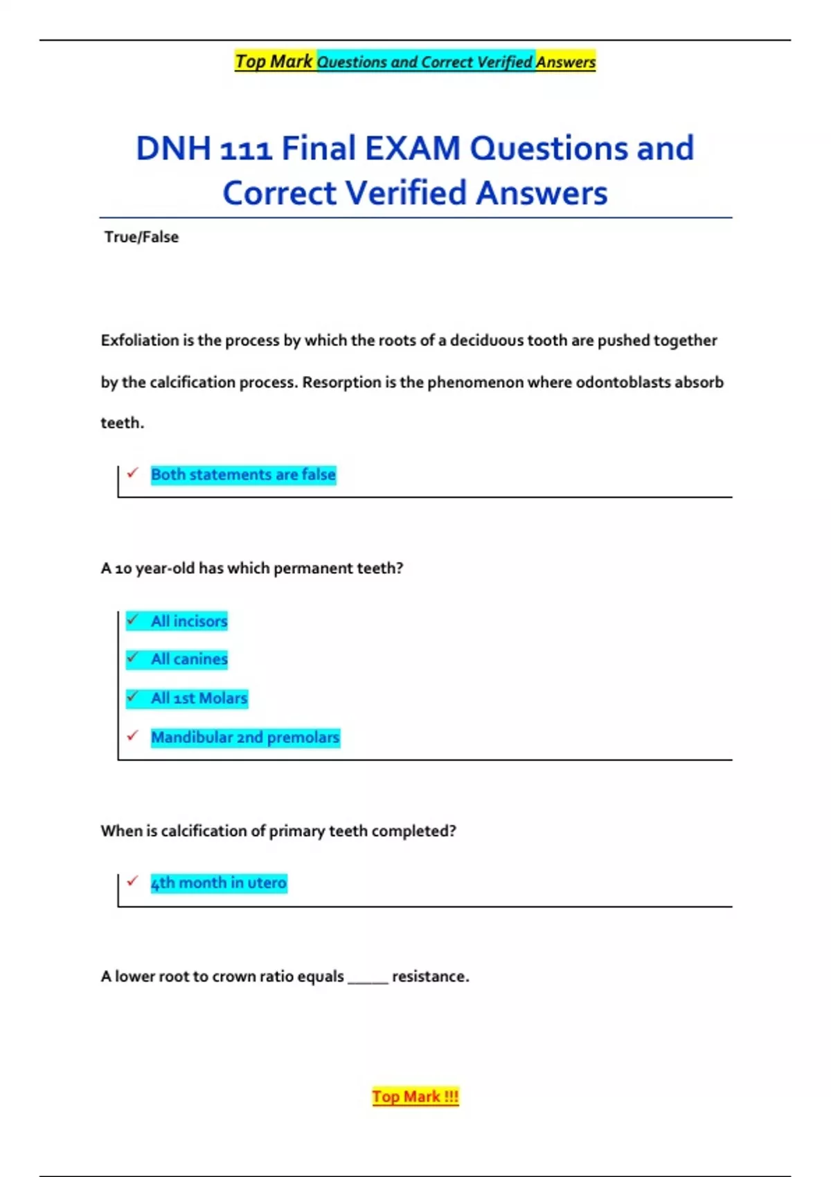 DNH 111 Final EXAM Questions and
