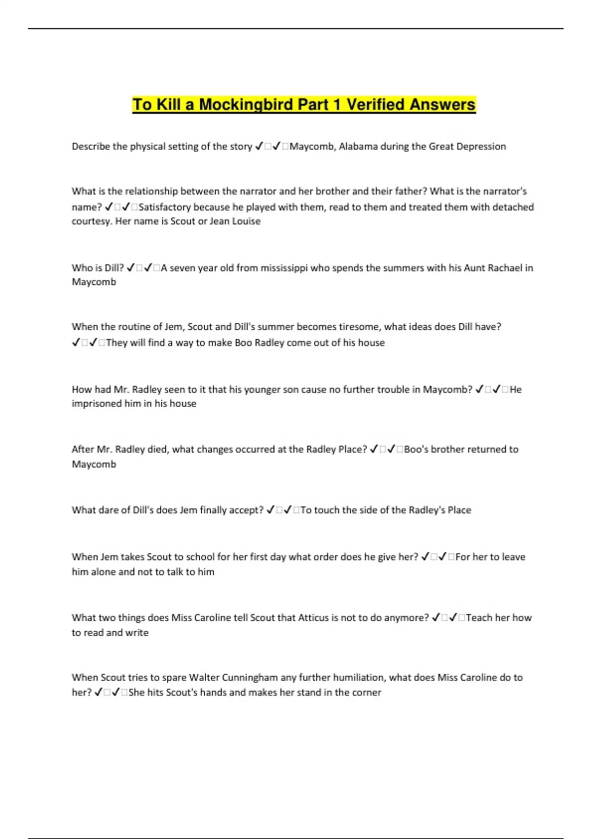 To Kill a Mockingbird Part 1 Verified Answers Describe the physical setting of the story ️️Maycomb, Alabama during the Great Depression What is the relationship between the narrator and her brother and their father? What is the narrator's name? ️️Satisfactory because he played with them, read to them and treated them with detached courtesy. Her name is Scout or Jean Louise Who is Dill? ️️A seven year old from mississippi who spends the summers with his Aunt Rachael in Maycomb When the routine of Jem, Scout and Dill's summer becomes tiresome, what ideas does Dill have? ️️They will find a way to make Boo Radley come out of his house How had Mr. Radley seen to it that his younger son cause no further trouble in Maycomb? ️️He imprisoned him in his house After Mr. Radley died, what changes occurred at the Radley Place? ️️Boo's brother returned to Maycomb What dare of Dill's does Jem finally accept? ️️To touch the side of the Radley's Place When Jem takes Scout to school for her first day what order does he give her? ️️For her to leave him alone and not to talk to him What two things does Miss Caroline tell Scout that Atticus is not to do anymore? ️️Teach her how to read and write When Scout tries to spare Walter Cunningham any further humiliation, what does Miss Caroline do to her? ️️She hits Scout's hands and makes her stand in the corner At the Finch's lunch, what reason does Walter give Atticus for not being able to pass the first grade? ️️Walter needs to help his dad every spring to bring in the harvest After Calpurnia makes Scout leave the table, what lecture does she give scout? ️️She lectures her about treating Walter as company and how much money people have doesn't matter How does Scout describe Burris Ewell's physical appearance? How does Little Charles litte describe Burris's personality? ️️Scout describes Burris Ewell as the filthiest human alive, while Charles describes Buriss as mean AFter Scout's first day of school what is her assessment and what is her plan? ️️Scouts assignment is to refrain from reading. Her plan was to try to get Atticus to let her quit school. After Scout begs Atticus not to make her return to school, what advice does he give her for getting along with people? ️️To get along with people get into other peoples point of view by stepping into their shoes. Explain why scout goes back to the Radley place one afternoon. ️️She sees gum in the tree. What is the neighborhood's opinion of Mrs. Dubose? ️️She is a very mean woman and she is old. What does Jem say about the indian heads they find in the knot hole of the tree? ️️They are someone else's and they have been well taken care of and are very expensive. What new game do Jem, Scout, and Dill play? ️️They play Boo Radley. After Atticus catches the children with the scissors what is Jem's reaction and what is Scout's? ️️Jem wants to keep playing and Scout wants to stop Explain why Scout becomes annoyed with Dill. ️️Because he confesses his love for her and then neglects her What does Miss Maudie tell Scout about some kind of men? ️️That some men are so worried about theirnext life more than this one What is Jem and Dill's plan to contact Boo? ️️To give him a note by sticking it through his crack in his window shutters. What order does Atticus give the children regarding Boo? ️️To leave him alone and stop making fun of him and his family. Why do Dill, Jem, and Scout run from the Radley place? ️️Because they hear a gunshot. How does dill explain jem's missing pants ️️They are playing strip poker and I guess that gem lost and he gave he gave his pants to dill what according to scout causes jem and her to part company ️️On this is gem had to retrieve his hand so I have pants is not find them in the neighbors yard summarize scout's assessment of second grade? ️️She says it was grim what does jem finally tell scout about his pants he retrieved? ️️That they were sown what do jem and scout realize about the carved soap figures they find in the knot hole ️️The carved soap were them when jem and scout find the knot hole filled with cement what explanation does nathan radley give? what does attic say? ️️Nathan says that the tree is dying a lot Atticus says it is healthy describe how jem constructs his snowman. what compliment does atticus pay him ️️jem constructs it from mud and a little snow and atticus tell him that he is not worried what he will be, one day What does atticus criticized Jem for ️️he says by making figures of the neighbors is not appropriate why does atticus wake the children in the middle of the night? ️️miss maudies house burns down What is Scouts wearing? How does Atticus explain the presence of what Scout is wearing? ️️atticus says that boo put a blanket on her describe scouts reaction to knowing that boo touched her ️️She nearly threw up. What is miss maudies reaction to the loss of her house? ️️She says that she always hated the house and that when she does the new house will have my room for her garden Why does scout forget what atticus told her about fighting? ️️Because she got so mad What does Atticus tell scouts to do when she hears ugly talk at school ️️To ignore them What comparison does Scout used to describe her relationship with her aunt Alexandra? ️️Like Mount Everest cold and there Explain Scout's reasoning regarding her cussing fluently ️️She is cussing so atticus will think that she got it from school and won't make her go Why does Scout fight Francis? ️️He says Atticus is a disgrace to their family and he is a "african american lover" Does scout make her uncle Jack promise not to tell how to keep the truth about? ️️About what Francis said about Atticus and how she fought Francis.
